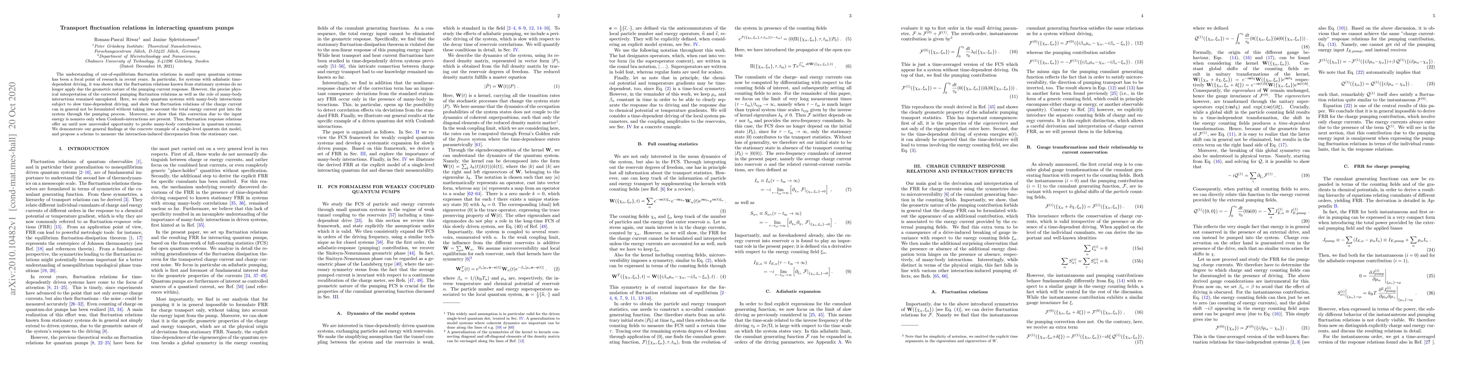 The understanding of out-of-equilibrium fluctuation relations in small open quantum systems has been a focal point of research in recent years. In particular, for systems with adiabatic time-dependent driving, it was shown that the fluctuation relations known from stationary systems do no longer apply due the geometric nature of the pumping current response. However, the precise physical interpretation of the corrected pumping fluctuation relations as well as the role of many-body interactions remained unexplored. Here, we study quantum systems with many-body interactions subject to slow time-dependent driving, and show that fluctuation relations of the charge current can in general not be formulated without taking into account the total energy current put into the system through the pumping process. Moreover, we show that this correction due to the input energy is nonzero only when Coulomb-interactions are present. Thus, fluctuation response relations offer an until now unrevealed opportunity to probe many-body correlations in quantum systems. We demonstrate our general findings at the concrete example of a single-level quantum dot model, and propose a scheme to measure the interaction-induced discrepancies from the stationary case.