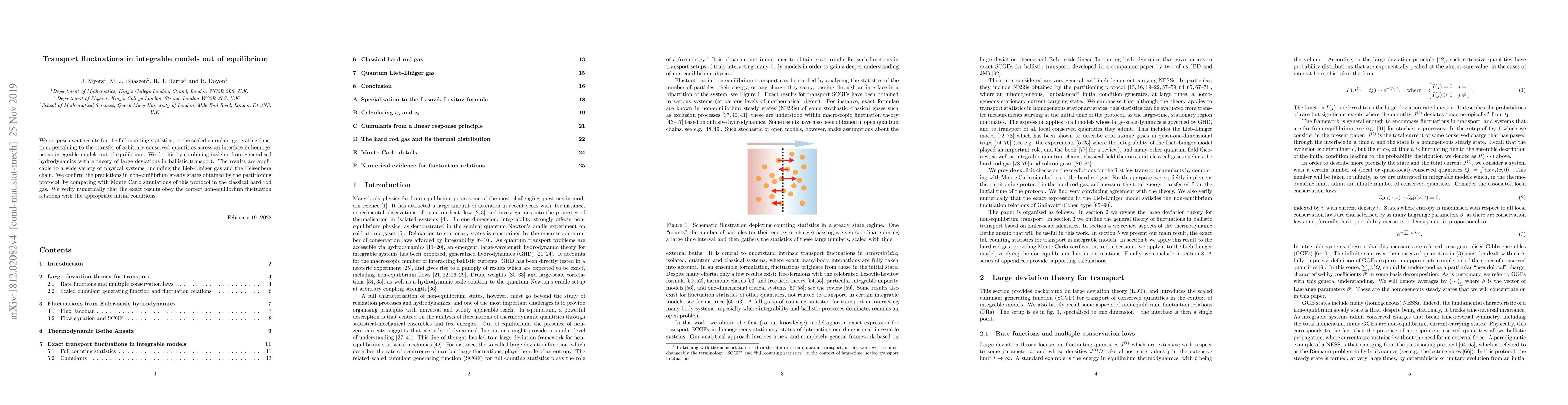 This paper presents exact results for the full counting statistics of conserved quantities in integrable models out of equilibrium, combining generalised hydrodynamics and large deviations theory. The findings are validated through Monte Carlo simulations and show compliance with non-equilibrium fluctuation relations.