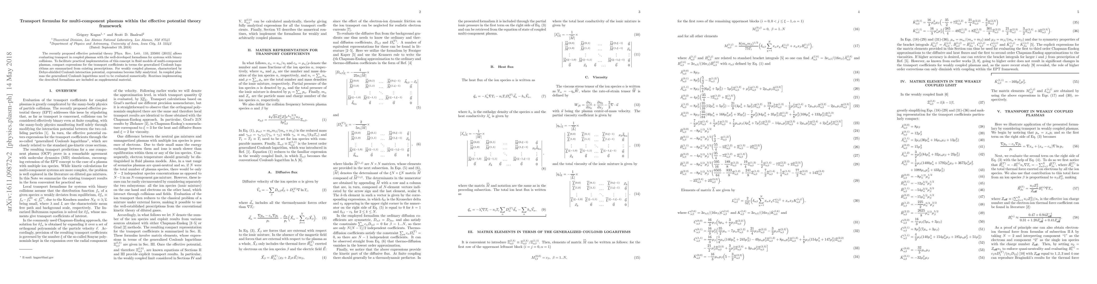 This paper presents compact expressions for transport coefficients in multi-component plasmas using effective potential theory, with fully analytical results for weakly coupled plasmas and numerical routines for coupled plasmas. Supplemental material includes implementation routines for the proposed formalisms.