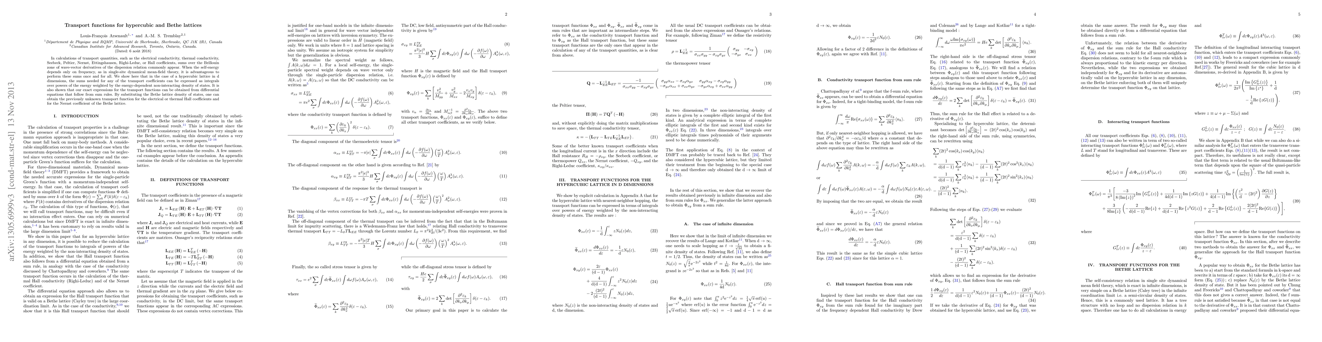 This paper presents analytical expressions for transport coefficients in hypercubic lattices and derives previously unknown transport functions for the Bethe lattice, using integrals over energy-weighted density of states and differential equations derived from sum rules.