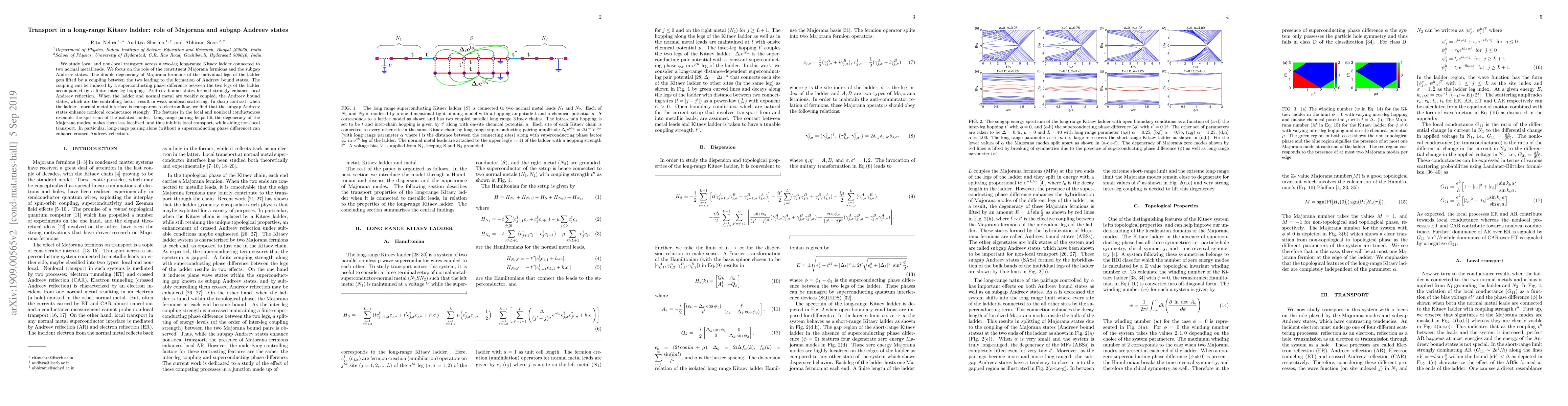 This paper investigates transport properties in a long-range Kitaev ladder connected to normal metal leads, emphasizing the impact of Majorana fermions and subgap Andreev states. It finds that Andreev bound states enhance local Andreev reflection and nonlocal conductance, with long-range pairing aiding nonlocal transport while inhibiting local transport.