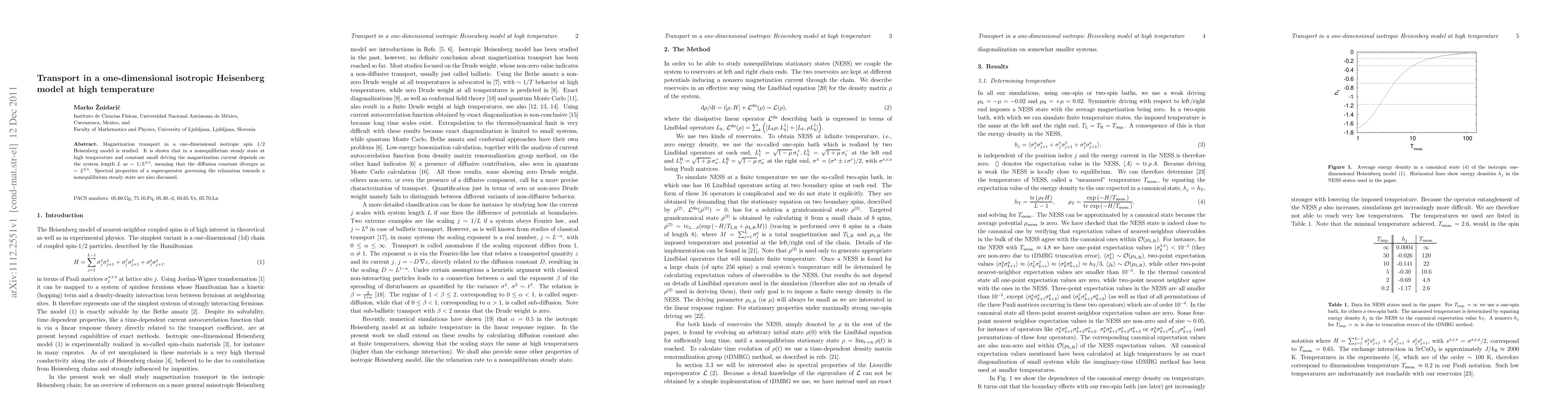 This paper investigates magnetization transport in a one-dimensional isotropic spin 1/2 Heisenberg model at high temperatures, revealing that the magnetization current scales as 1/L^{0.5} with system length L, indicating a diverging diffusion constant. The study also explores the spectral properties of the superoperator responsible for relaxation to the nonequilibrium steady state.