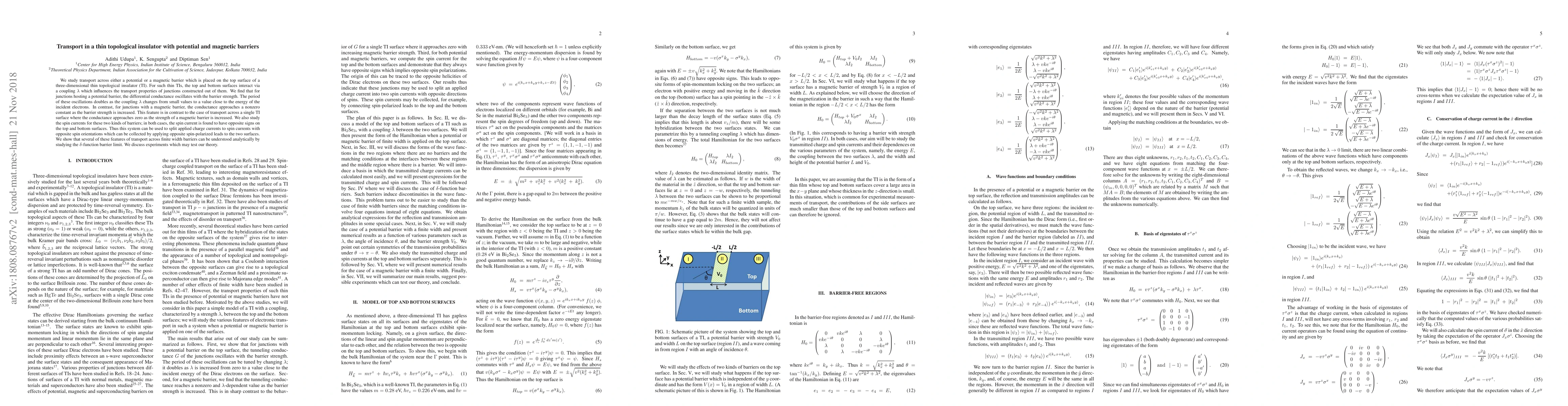 We study transport across either a potential or a magnetic barrier which is placed on the top surface of a three-dimensional thin topological insulator (TI). For such thin TIs, the top and bottom surfaces interact via a coupling $\lambda$ which influences the transport properties of junctions constructed out of them. We find that for junctions hosting a potential barrier, the differential conductance oscillates with the barrier strength. The period of these oscillations doubles as the coupling $\lambda$ changes from small values to a value close to the energy of the incident electrons. In contrast, for junctions with a magnetic barrier, the conductance approaches a non-zero constant as the barrier strength is increased. This feature is in contrast to the case of transport across a single TI surface where the conductance approaches zero as the strength of a magnetic barrier is increased. We also study the spin currents for these two kinds of barriers; in both cases, the spin current is found to have opposite signs on the top and bottom surfaces. Thus this system can be used to split applied charge currents to spin currents with opposite spin orientations which can be collected by applying opposite spin-polarized leads to the two surfaces. We show that several of these features of transport across finite width barriers can be understood analytically by studying the $\delta$-function barrier limit. We discuss experiments which may test our theory.