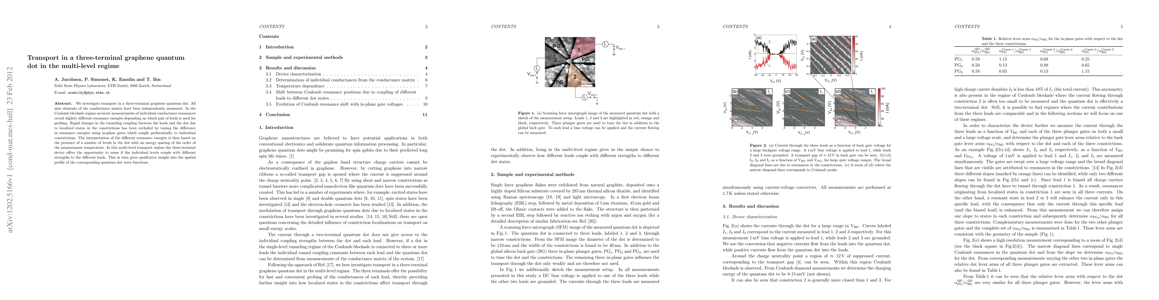 We investigate transport in a three-terminal graphene quantum dot. All nine elements of the conductance matrix have been independently measured. In the Coulomb blockade regime accurate measurements of individual conductance resonances reveal slightly different resonance energies depending on which pair of leads is used for probing. Rapid changes in the tunneling coupling between the leads and the dot due to localized states in the constrictions has been excluded by tuning the difference in resonance energies using in-plane gates which couple preferentially to individual constrictions. The interpretation of the different resonance energies is then based on the presence of a number of levels in the dot with an energy spacing of the order of the measurement temperature. In this multi-level transport regime the three-terminal device offers the opportunity to sense if the individual levels couple with different strengths to the different leads. This in turn gives qualitative insight into the spatial profile of the corresponding quantum dot wave functions.