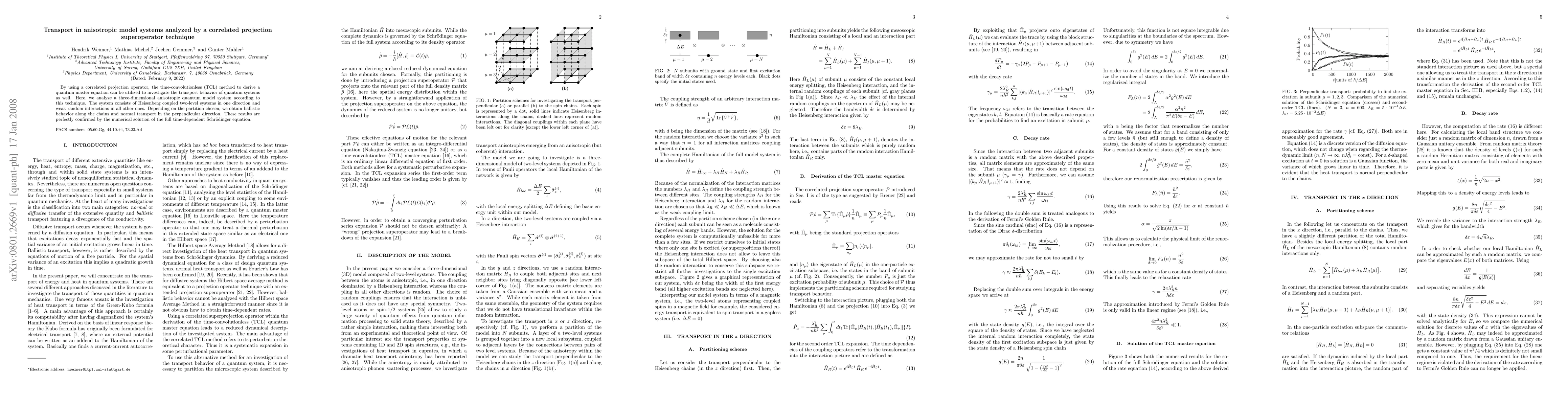 By using a correlated projection operator, the time-convolutionless (TCL) method to derive a quantum master equation can be utilized to investigate the transport behavior of quantum systems as well. Here, we analyze a three-dimensional anisotropic quantum model system according to this technique. The system consists of Heisenberg coupled two-level systems in one direction and weak random interactions in all other ones. Depending on the partition chosen, we obtain ballistic behavior along the chains and normal transport in the perpendicular direction. These results are perfectly confirmed by the numerical solution of the full time-dependent Schr\"odinger equation.