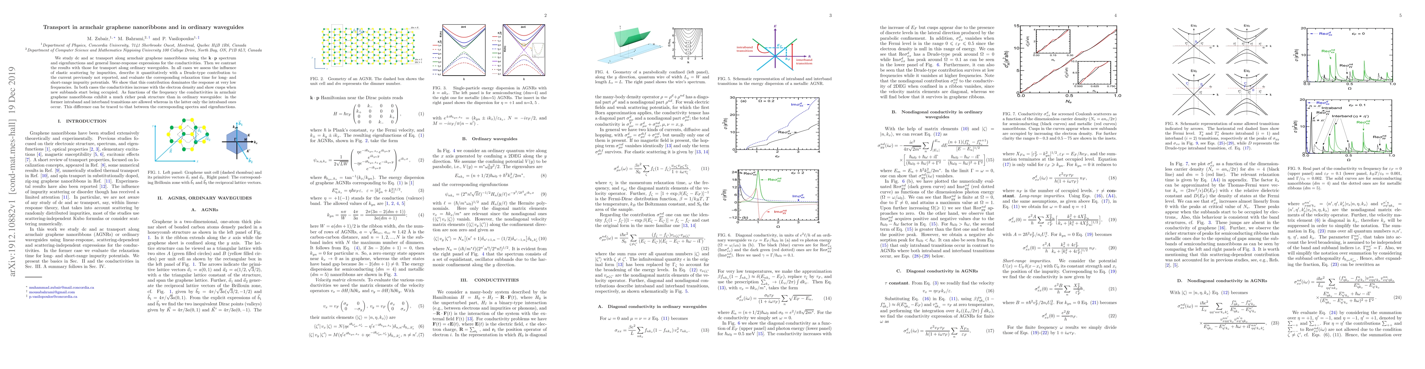 This paper investigates the transport properties of armchair graphene nanoribbons and ordinary waveguides, highlighting the influence of elastic scattering by impurities. It finds that the conductivities in armchair graphene nanoribbons show a more complex peak structure due to allowed intraband and interband transitions, unlike ordinary waveguides where only intraband transitions occur.
