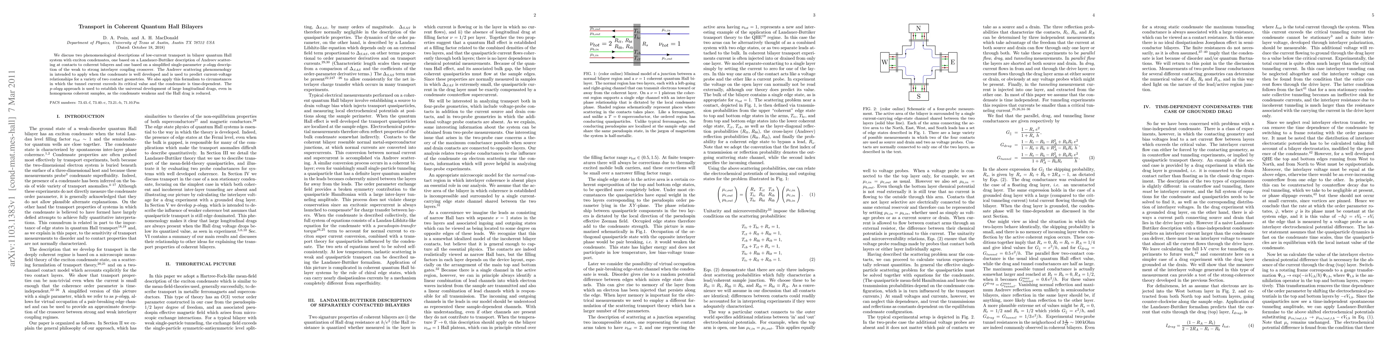 We discuss two phenomenological descriptions of low-current transport in bilayer quantum Hall system with exciton condensates, one based on a Landauer-Buttiker description of Andreev scattering at contacts to coherent bilayers and one based on a simplified single-parameter {\em p-ology} description of the weak to strong interlayer coupling crossover. The Andreev scattering phenomenology in intended to apply when the condensate is well developed and is used to predict current-voltage relationships for a variety of two contact geometries. We also apply this formalism to circumstances in which the tunnel current exceeds its critical value and the condensate is time-dependent. The {\em p-ology} approach is used to establish the universal development of large longitudinal drags, even in homogenous coherent samples, as the condensate weakens and the Hall drag is reduced.