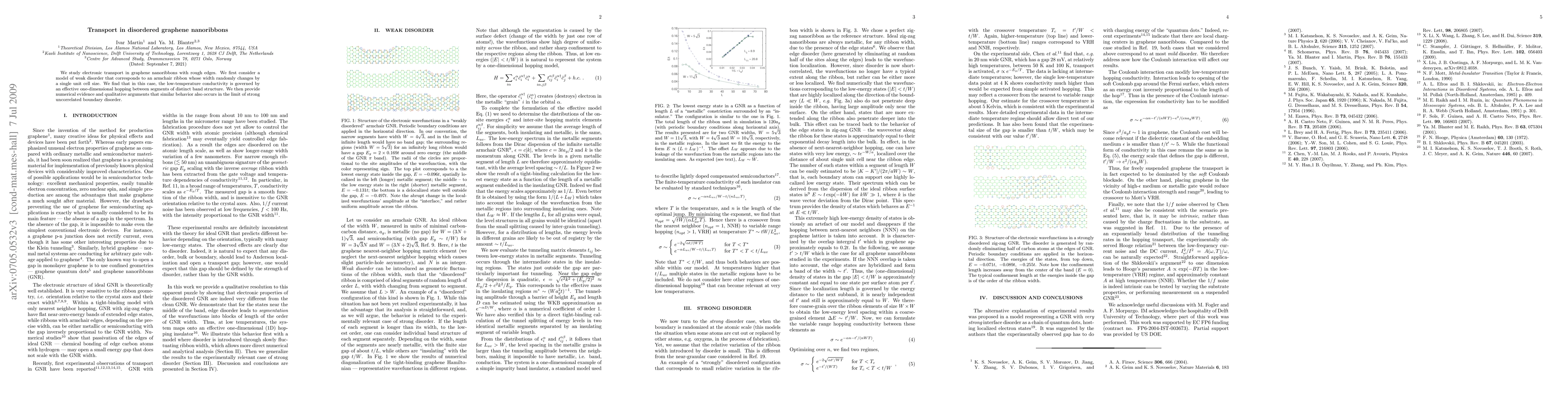 This paper investigates electronic transport in graphene nanoribbons with rough edges, revealing that low-temperature conductivity in weakly disordered armchair ribbons is driven by effective one-dimensional hopping. Numerical evidence suggests that this behavior extends to strongly disordered ribbons.