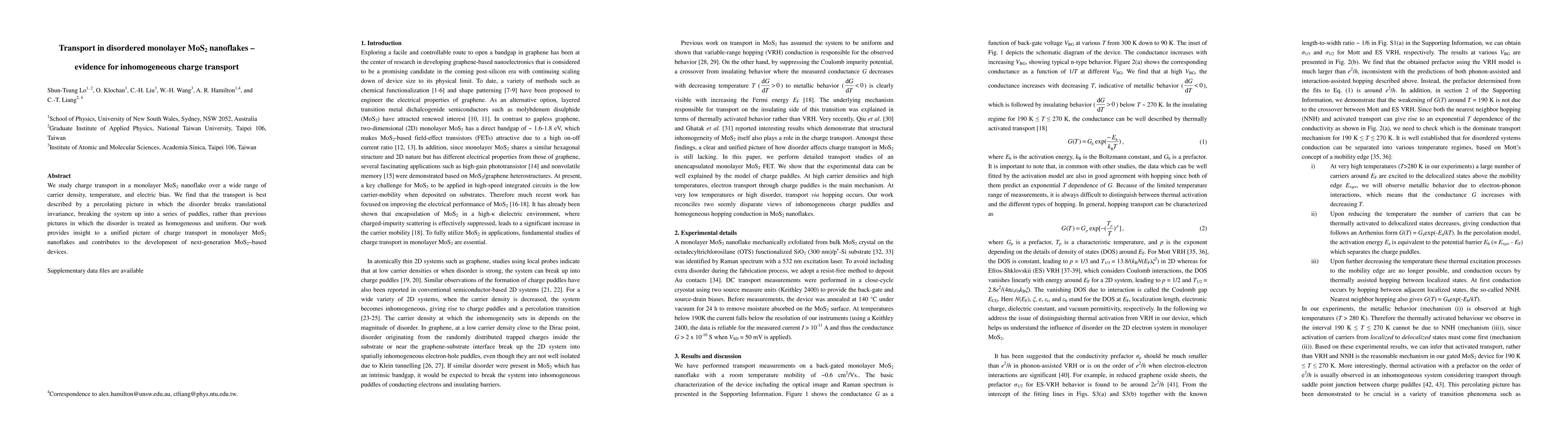 This study investigates charge transport in monolayer molybdenum disulfide nanoflakes, revealing inhomogeneous transport due to a percolating mechanism where disorder creates localized puddles. This insight challenges previous homogeneous models and aids in developing next-generation molybdenum disulfide devices.