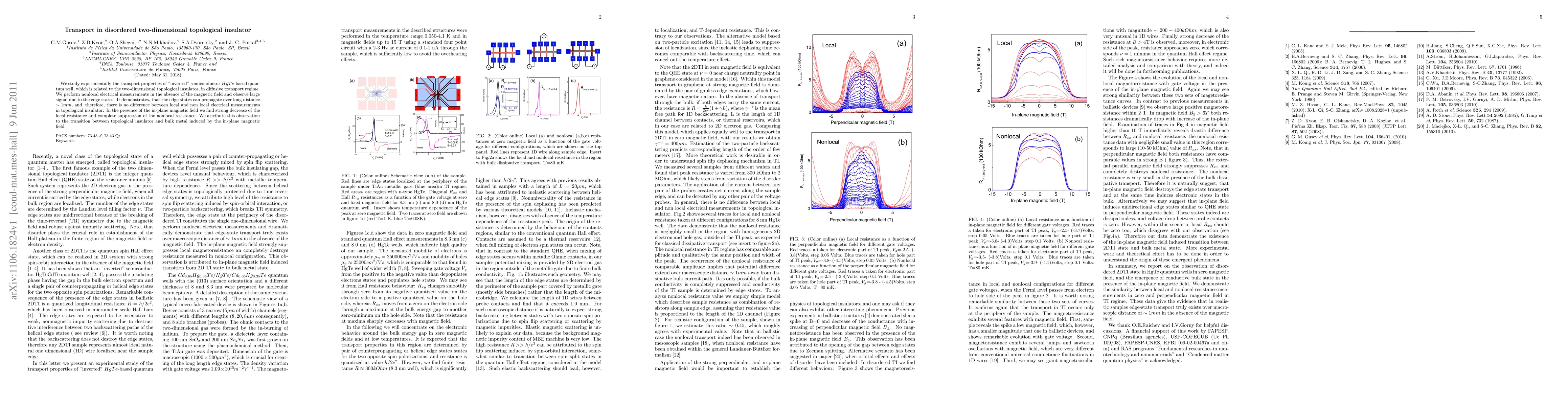 This research experimentally investigates transport in a disordered two-dimensional topological insulator using HgTe-based quantum wells. It finds that edge states propagate over long distances in the absence of magnetic fields, indicating similar local and nonlocal transport behaviors. The application of an in-plane magnetic field causes a significant decrease in local resistance and suppresses nonlocal resistance, suggesting a transition from topological insulator to bulk metal state.