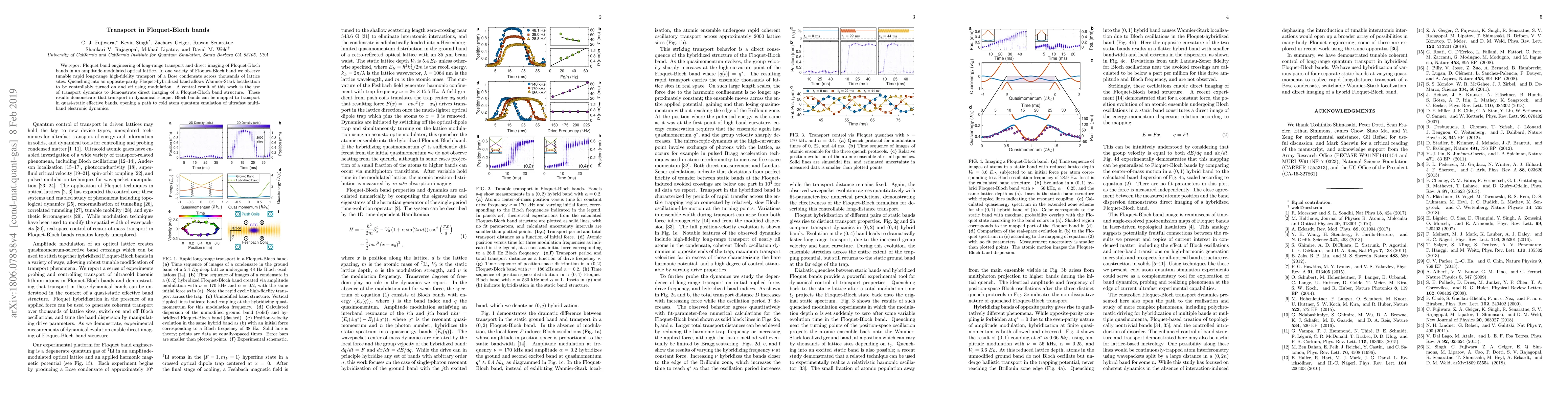This paper demonstrates the engineering of long-range transport in Floquet-Bloch bands using an amplitude-modulated optical lattice, showing high-fidelity transport of Bose condensates. It also reveals control over Wannier-Stark localization via modulation and uses transport dynamics to directly image the Floquet-Bloch band structure.