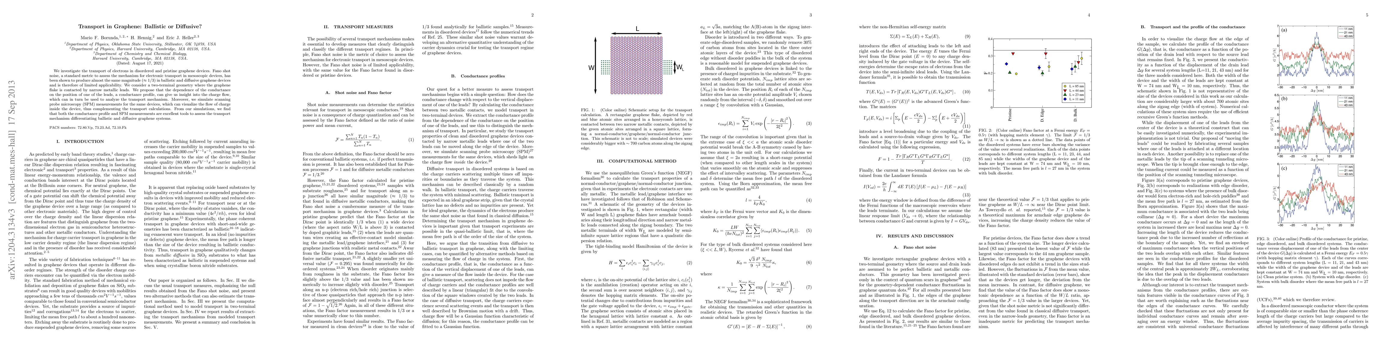 This paper investigates electron transport mechanisms in graphene devices, showing that Fano shot noise is insufficient to distinguish between ballistic and diffusive transport. It proposes using conductance profiles and scanning probe microscopy measurements to discern these mechanisms, finding these methods effective in differentiating between the two transport types.