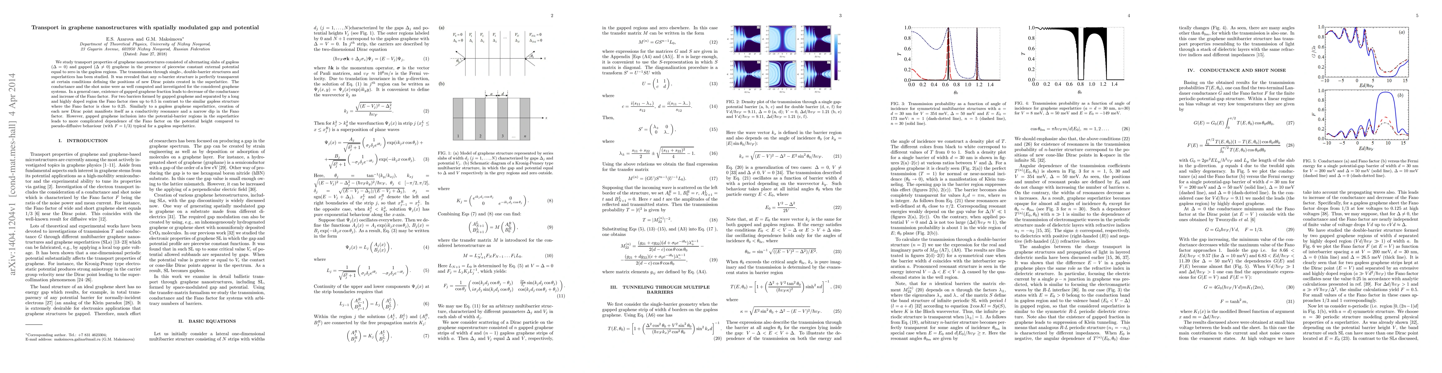 We study transport properties of graphene nanostructures consisted of alternating slabs of gapless and gapped graphene in the presence of piecewise constant external potential equal to zero in the gapless regions. The transmission through single-, double-barrier structures and superlattices has been studied. It was revealed that any n-barrier structure is perfectly transparent at certain conditions defining the positions of new Dirac points created in the superlattice. The conductance and the shot noise were as well computed and investigated for the considered graphene systems. In a general case, existence of gapped graphene fraction leads to decrease of the conductance and increase of the Fano factor. For two barriers formed by gapped graphene and separated by a long and highly doped region the Fano factor rises up to 0.5 in contrast to the similar gapless structure where the Fano factor is close to 0.25. Similarly to a gapless graphene superlattice, creation of each new Dirac point manifests itself as a conductivity resonance and a narrow dip in the Fano factor. However, gapped graphene inclusion into the potential-barrier regions in the superlattice leads to more complicated dependence of the Fano factor on the potential height compared to pseudo-diffusive behaviour (with F = 1/3) typical for a gapless superlattice.