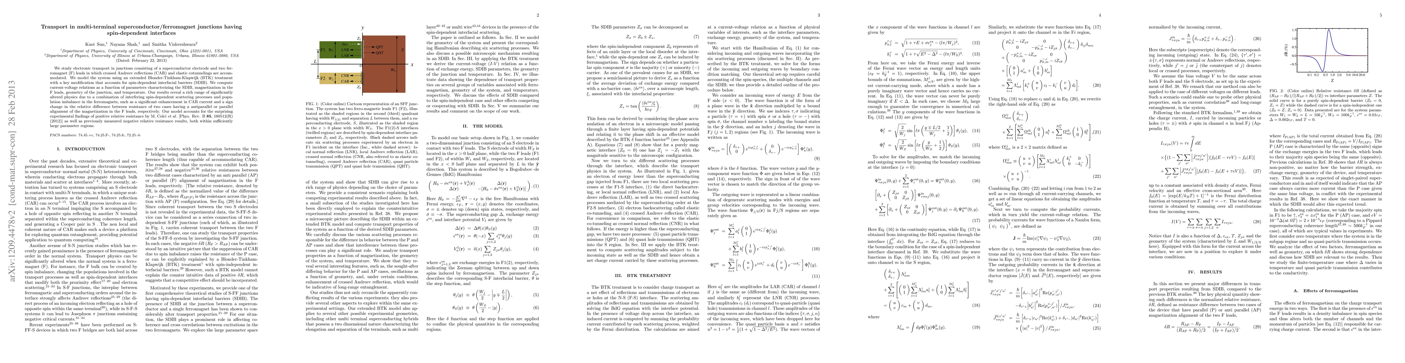 We study electronic transport in junctions consisting of a superconductor electrode and two ferromagnet (F) leads in which crossed Andreev reflections (CAR) and elastic cotunnelings are accommodated. We model the system using an extended Blonder-Tinkham-Klapwijk treatment with a key modification that accounts for spin-dependent interfacial barriers (SDIB). We compute current-voltage relations as a function of parameters characterizing the SDIB, magnetization in the F leads, geometry of the junction, and temperature. Our results reveal a rich range of significantly altered physics due to a combination of interfering spin-dependent scattering processes and population imbalance in the ferromagnets, such as a significant enhancement in CAR current and a sign change in the relative difference between resistance of two cases having a antiparallel or parallel alignment of the magnetization in the F leads, respectively. Our model accounts for the surprising experimental findings of positive relative resistance by M. Colci et al. [Phys. Rev. B 85, 180512(R) (2012)] as well as previously measured negative relative resistance results, both within sufficiently large parameter regions.