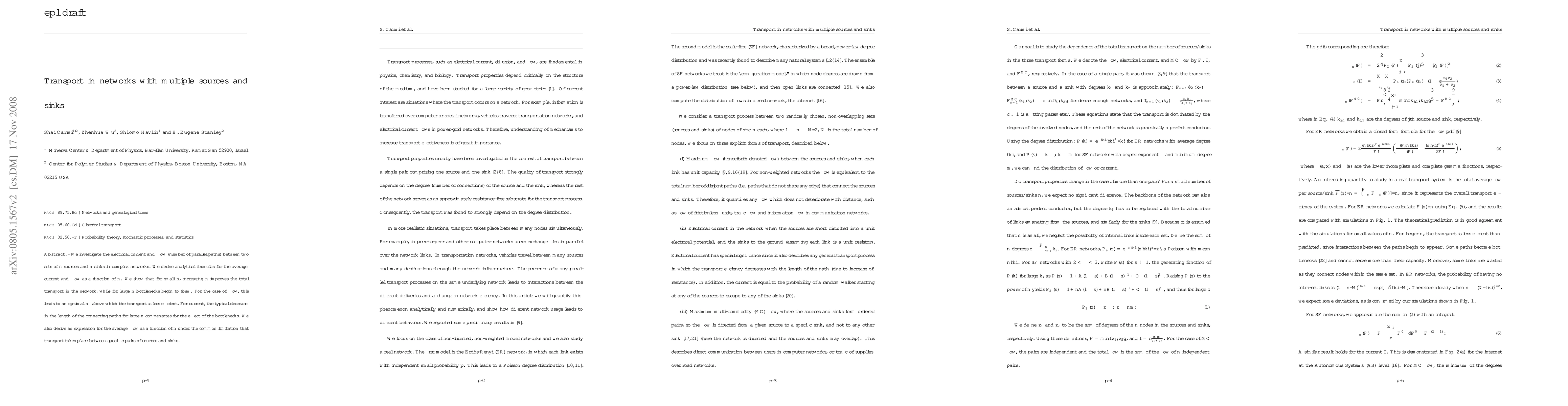 We investigate the electrical current and flow (number of parallel paths) between two sets of n sources and n sinks in complex networks. We derive analytical formulas for the average current and flow as a function of n. We show that for small n, increasing n improves the total transport in the network, while for large n bottlenecks begin to form. For the case of flow, this leads to an optimal n* above which the transport is less efficient. For current, the typical decrease in the length of the connecting paths for large n compensates for the effect of the bottlenecks. We also derive an expression for the average flow as a function of n under the common limitation that transport takes place between specific pairs of sources and sinks.