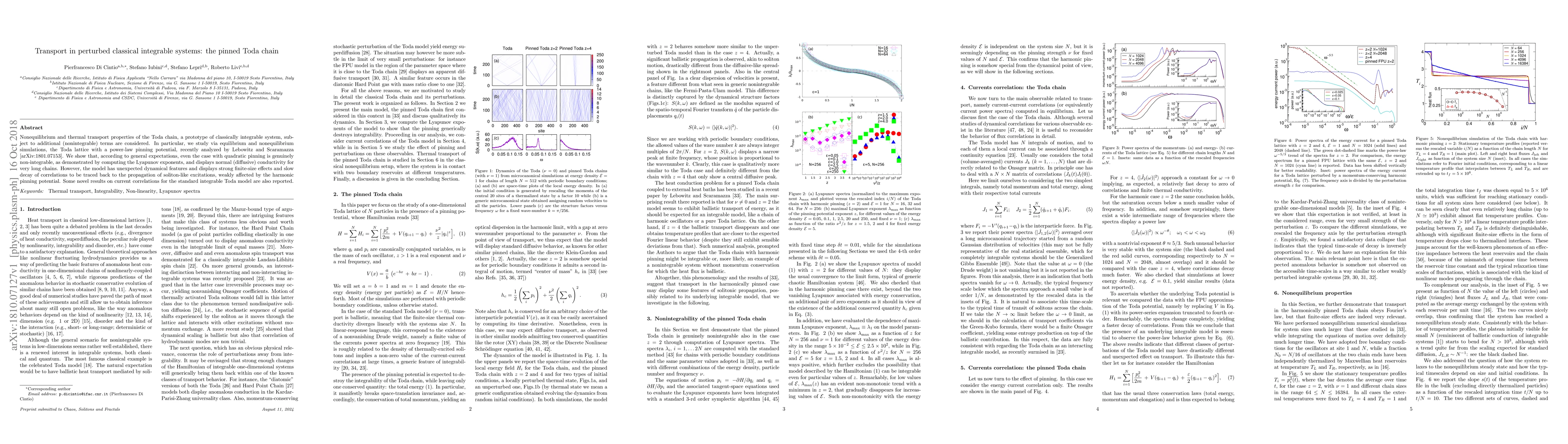 This study investigates the thermal and nonequilibrium transport in a perturbed Toda chain with a power-law pinning potential, demonstrating its non-integrability via Lyapunov exponents and normal conductivity. It reveals unexpected dynamics and strong finite-size effects due to soliton-like excitations, alongside novel findings on current correlations in the standard Toda model.