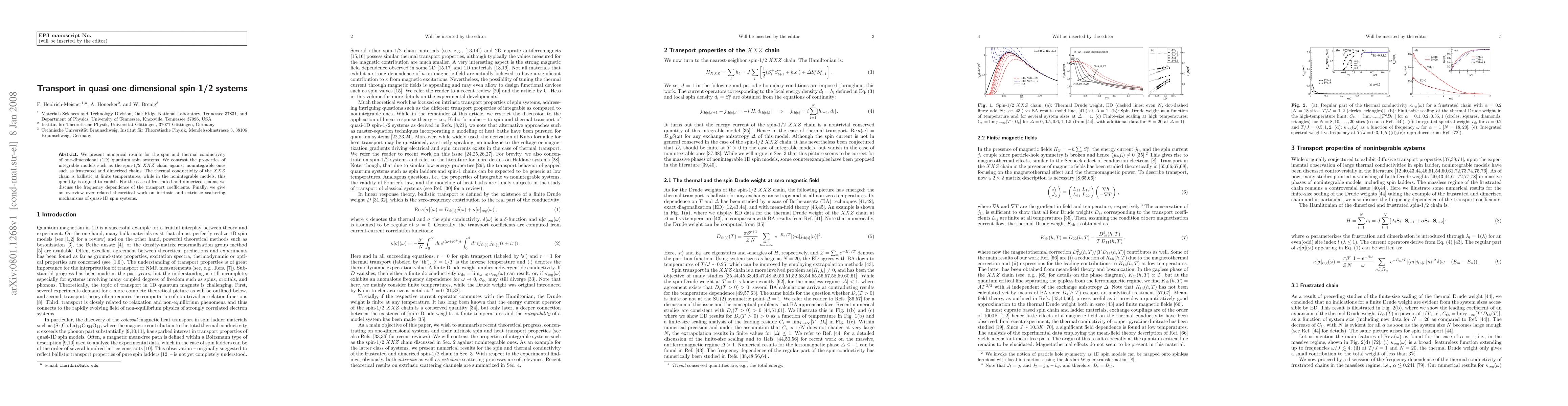 This paper numerically investigates the spin and thermal conductivity in quasi one-dimensional spin-1/2 systems, comparing integrable models like the XXZ chain with nonintegrable ones such as frustrated and dimerized chains, finding ballistic thermal conductivity in the former and vanishing in the latter, and discussing transport coefficient frequency dependence in the latter.