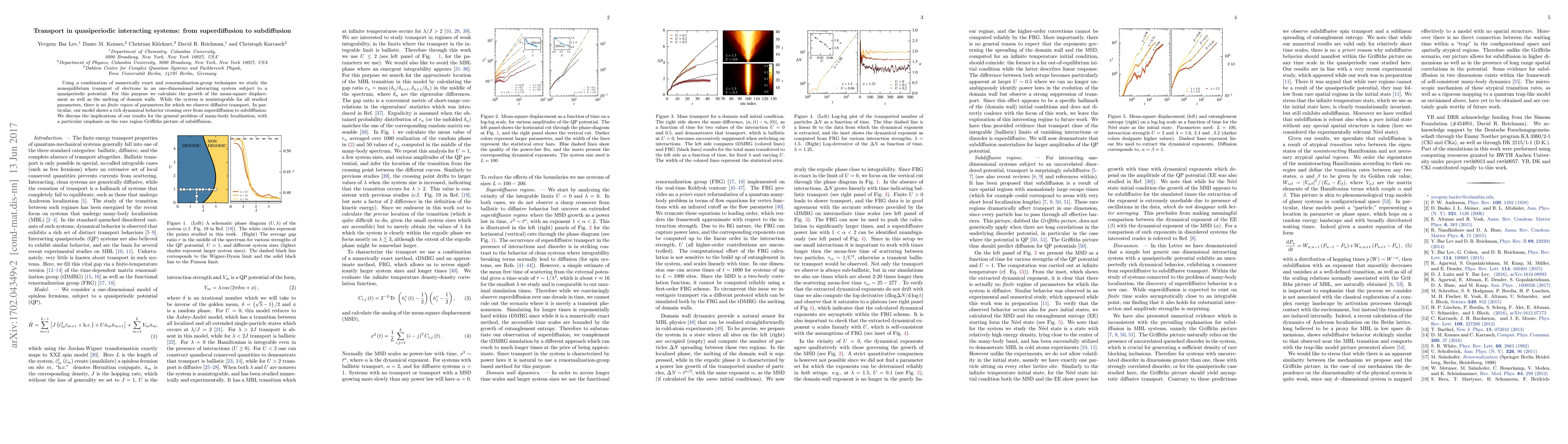 Using a combination of numerically exact and renormalization-group techniques we study the nonequilibrium transport of electrons in an one-dimensional interacting system subject to a quasiperiodic potential. For this purpose we calculate the growth of the mean-square displacement as well as the melting of domain walls. While the system is nonintegrable for all studied parameters, there is no on finite region default of parameters for which we observe diffusive transport. In particular, our model shows a rich dynamical behavior crossing over from superdiffusion to subdiffusion. We discuss the implications of our results for the general problem of many-body localization, with a particular emphasis on the rare region Griffiths picture of subdiffusion.