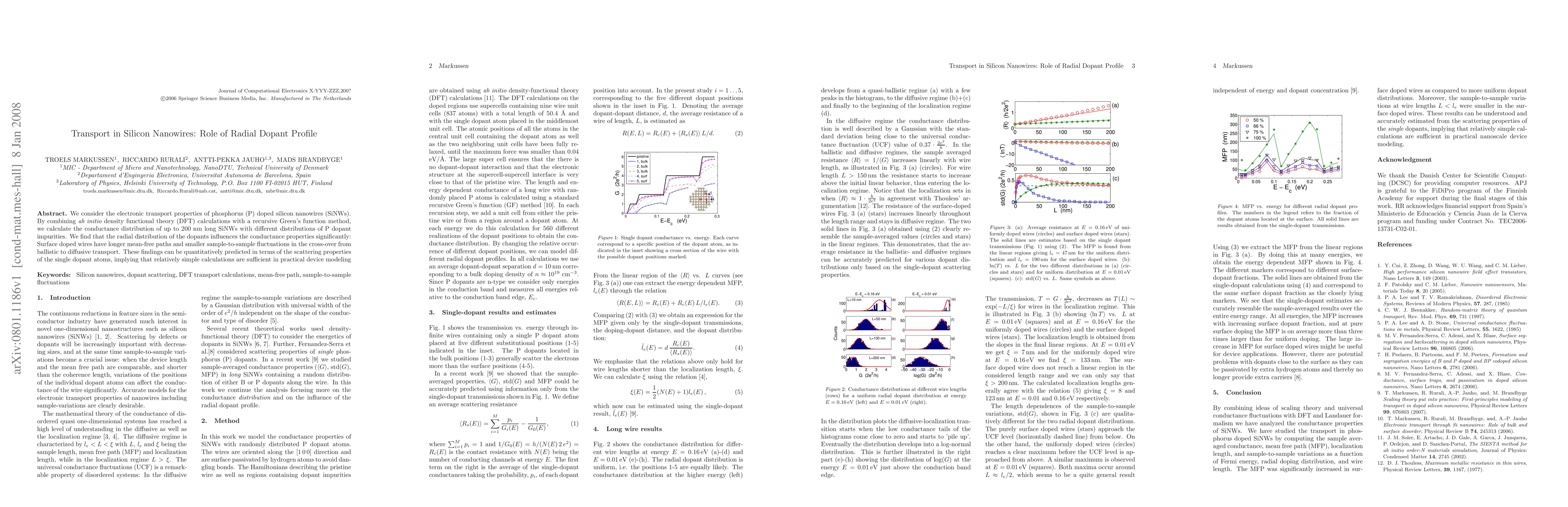 We consider the electronic transport properties of phosphorus (P) doped silicon nanowires (SiNWs). By combining ab initio density functional theory (DFT) calculations with a recursive Green's function method, we calculate the conductance distribution of up to 200 nm long SiNWs with different distributions of P dopant impurities. We find that the radial distribution of the dopants influences the conductance properties significantly: Surface doped wires have longer mean-free paths and smaller sample-to-sample fluctuations in the cross-over from ballistic to diffusive transport. These findings can be quantitatively predicted in terms of the scattering properties of the single dopant atoms, implying that relatively simple calculations are sufficient in practical device modeling