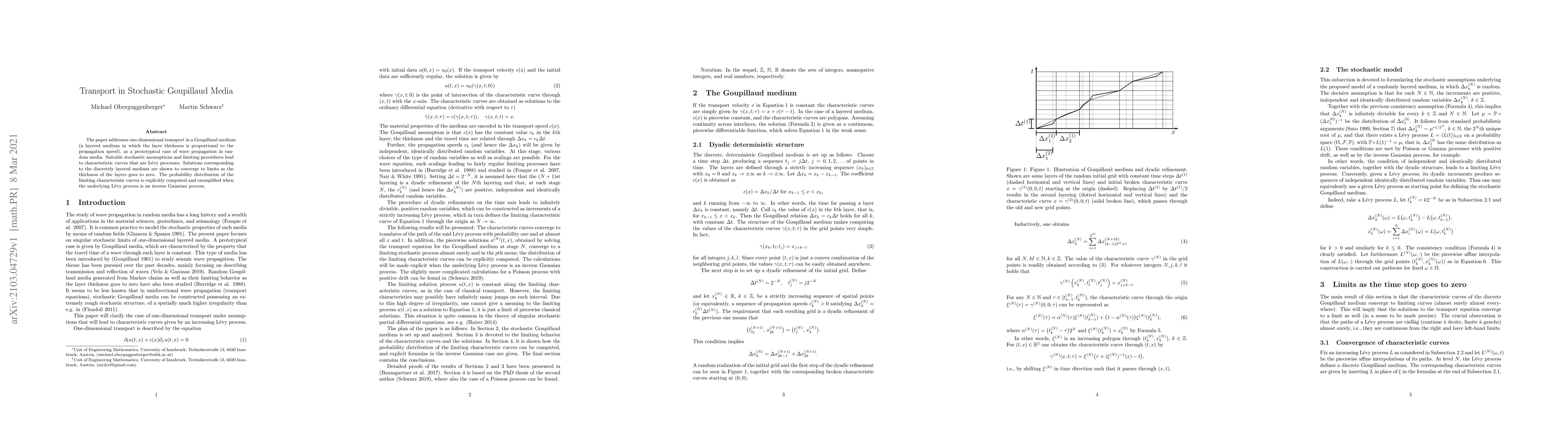 The paper addresses one-dimensional transport in a Goupillaud medium (a layered medium in which the layer thickness is proportional to the propagation speed), as a prototypical case of wave propagation in random media. Suitable stochastic assumptions and limiting procedures lead to characteristic curves that are L\'evy processes. Solutions corresponding to the discretely layered medium are shown to converge to limits as the thickness of the layers goes to zero. The probability distribution of the limiting characteristic curves is explicitly computed and exemplified when the underlying L\'evy process is an inverse Gaussian process.