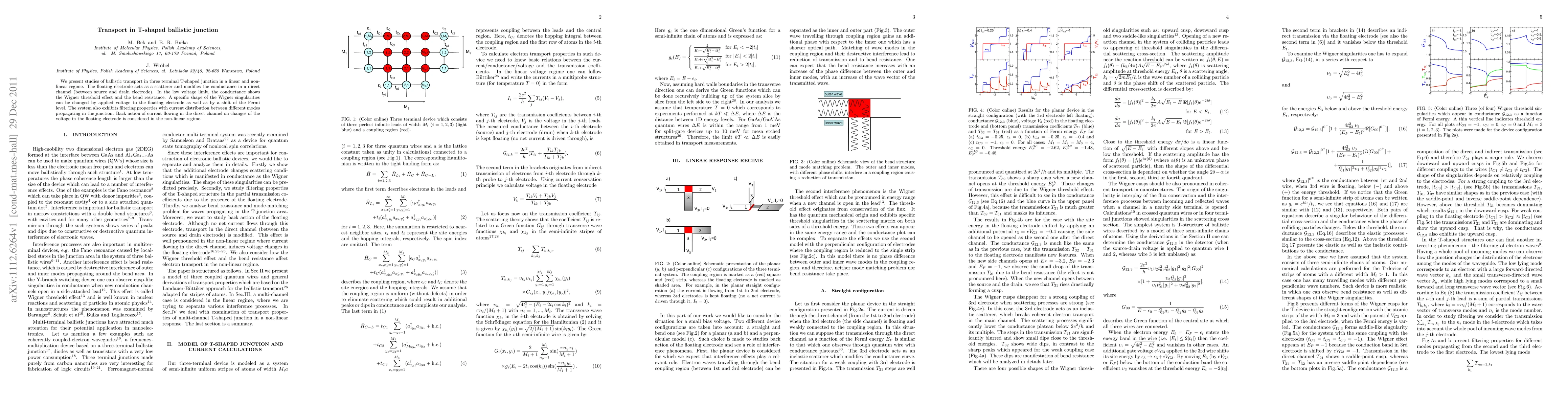 We present studies of ballistic transport in three terminal T-shaped junction in a linear and non-linear regime. The floating electrode acts as a scatterer and modifies the conductance in a direct channel (between source and drain electrode). In the low voltage limit, the conductance shows the Wigner threshold effect and the bend resistance. A specific shape of the Wigner singularities can be changed by applied voltage to the floating electrode as well as by a shift of the Fermi level. The system also exhibits filtering properties with current distribution between different modes propagating in the junction. Back action of current flowing in the direct channel on changes of the voltage in the floating electrode is considered in the non-linear regime.