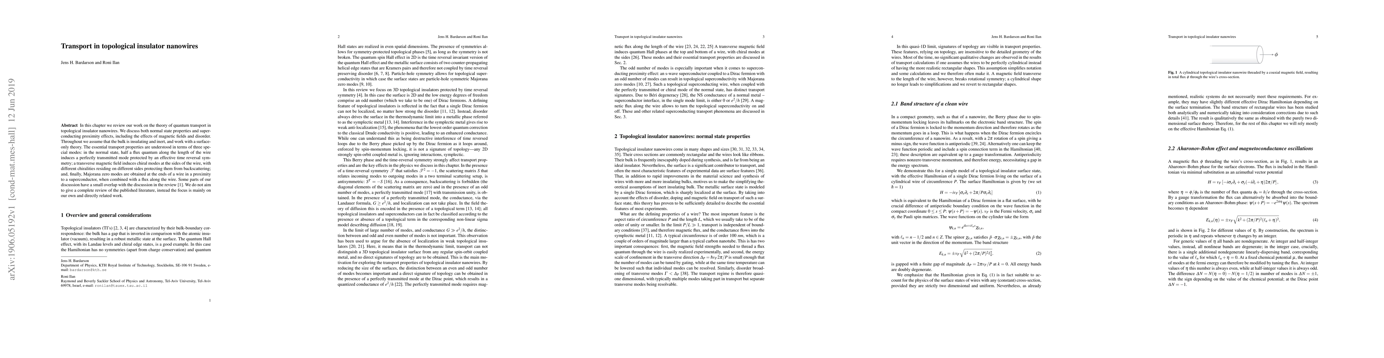 In this chapter we review our work on the theory of quantum transport in topological insulator nanowires. We discuss both normal state properties and superconducting proximity effects, including the effects of magnetic fields and disorder. Throughout we assume that the bulk is insulating and inert, and work with a surface-only theory. The essential transport properties are understood in terms of three special modes: in the normal state, half a flux quantum along the length of the wire induces a perfectly transmitted mode protected by an effective time reversal symmetry; a transverse magnetic field induces chiral modes at the sides of the wire, with different chiralities residing on different sides protecting them from backscattering; and, finally, Majorana zero modes are obtained at the ends of a wire in a proximity to a superconductor, when combined with a flux along the wire. Some parts of our discussion have a small overlap with the discussion in the review [Bardarson and Moore, Rep. Prog. Phys., 76, 056501, (2013)]. We do not aim to give a complete review of the published literature, instead the focus is mainly on our own and directly related work.