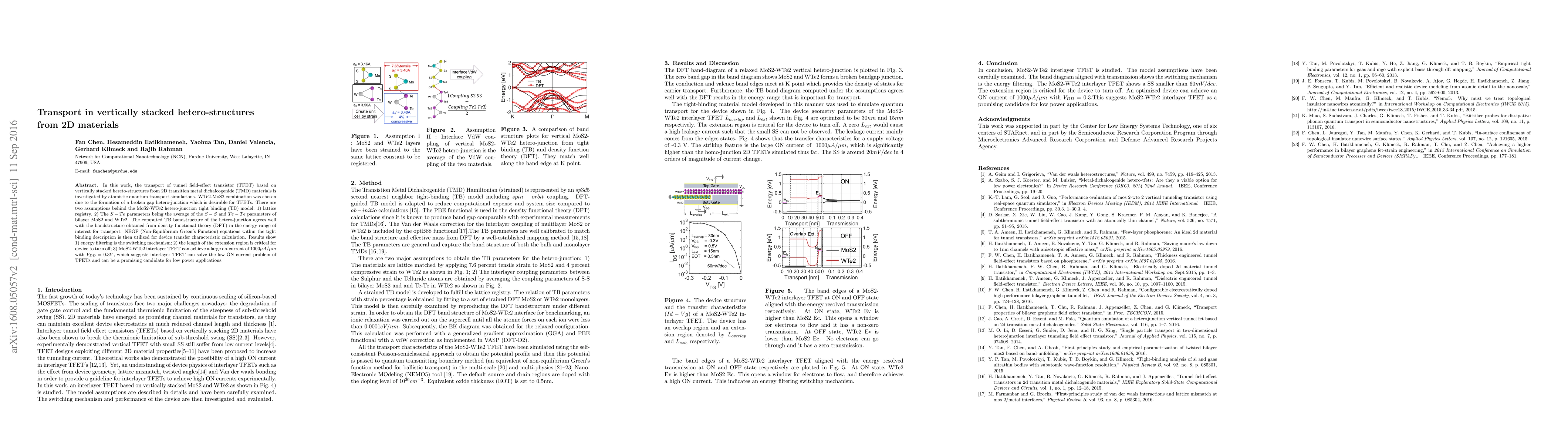 In this work, the transport of tunnel field-effect transistor (TFET) based on vertically stacked hereto-structures from 2D transition metal dichalcogenide (TMD) materials is investigated by atomistic quantum transport simulations. WTe2-MoS2 combination was chosen due to the formation of a broken gap hetero-junction which is desirable for TFETs. There are two assumptions behind the MoS2-WTe2 hetero-junction tight binding (TB) model: 1) lattice registry. 2) The $S-Te$ parameters being the average of the $S-S$ and $Te-Te$ parameters of bilayer MoS2 and WTe2. The computed TB bandstructure of the hetero-junction agrees well with the bandstructure obtained from density functional theory (DFT) in the energy range of interest for transport. NEGF (Non-Equilibrium Green$'$s Function) equations within the tight binding description is then utilized for device transfer characteristic calculation. Results show 1) energy filtering is the switching mechanism; 2) the length of the extension region is critical for device to turn off; 3) MoS2-WTe2 interlayer TFET can achieve a large on-current of $1000 \mu A/\mu m$ with $V_{DD} = 0.3V$, which suggests interlayer TFET can solve the low ON current problem of TFETs and can be a promising candidate for low power applications.