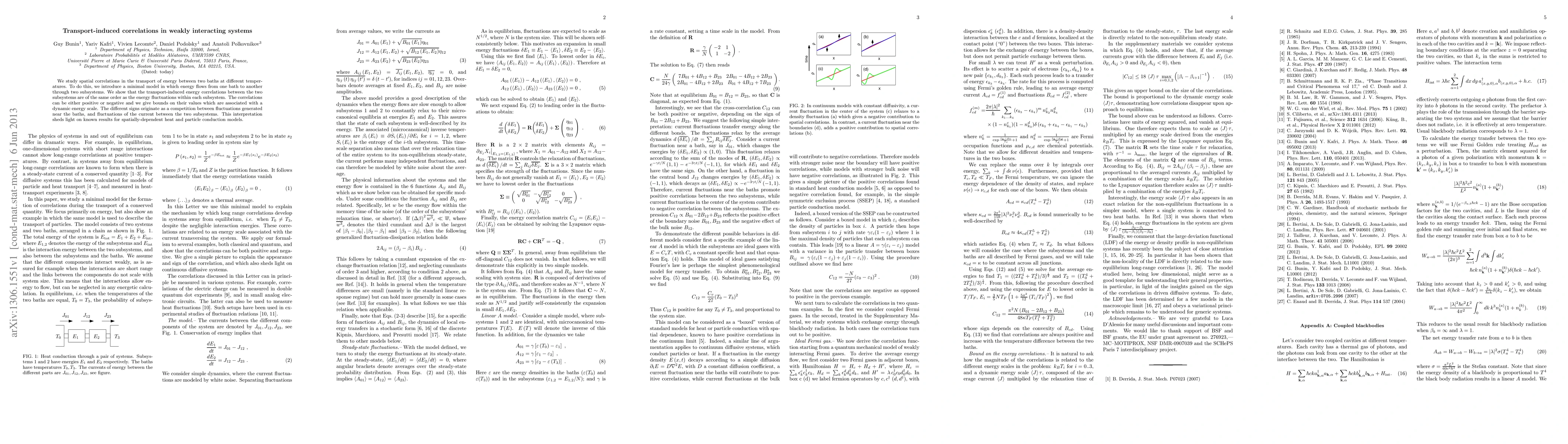 We study spatial correlations in the transport of energy between two baths at different temperatures. To do this, we introduce a minimal model in which energy flows from one bath to another through two subsystems. We show that the transport-induced energy correlations between the two subsystems are of the same order as the energy fluctuations within each subsystem. The correlations can be either positive or negative and we give bounds on their values which are associated with a dynamic energy scale. The different signs originate as a competition between fluctuations generated near the baths, and fluctuations of the current between the two subsystems. This interpretation sheds light on known results for spatially-dependent heat and particle conduction models.