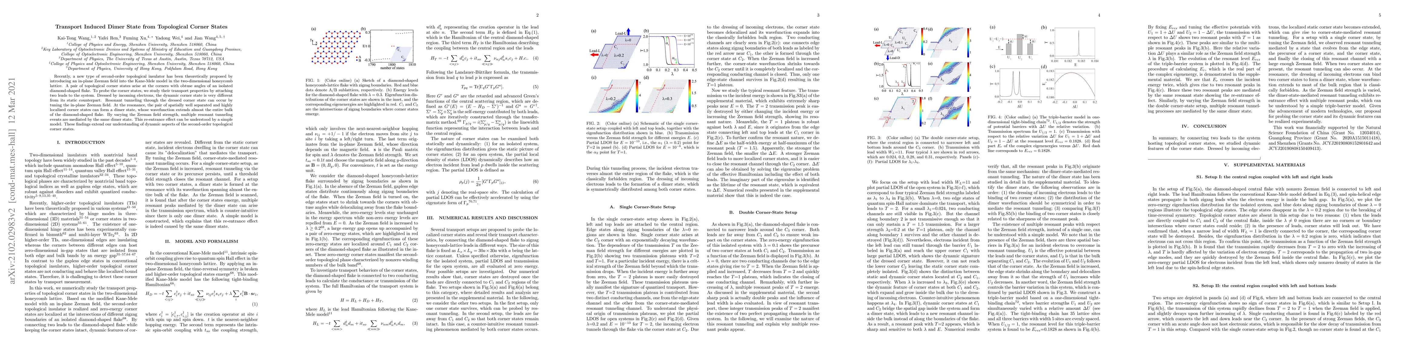 This paper investigates the transport properties of topological corner states in a second-order topological insulator formed by an in-plane Zeeman field in the Kane-Mele model. The study reveals that resonant tunneling through dressed corner states can create a dimer state, which extends across the bulk of the diamond-shaped flake, and mediates multiple tunneling events via a re-entrance effect.