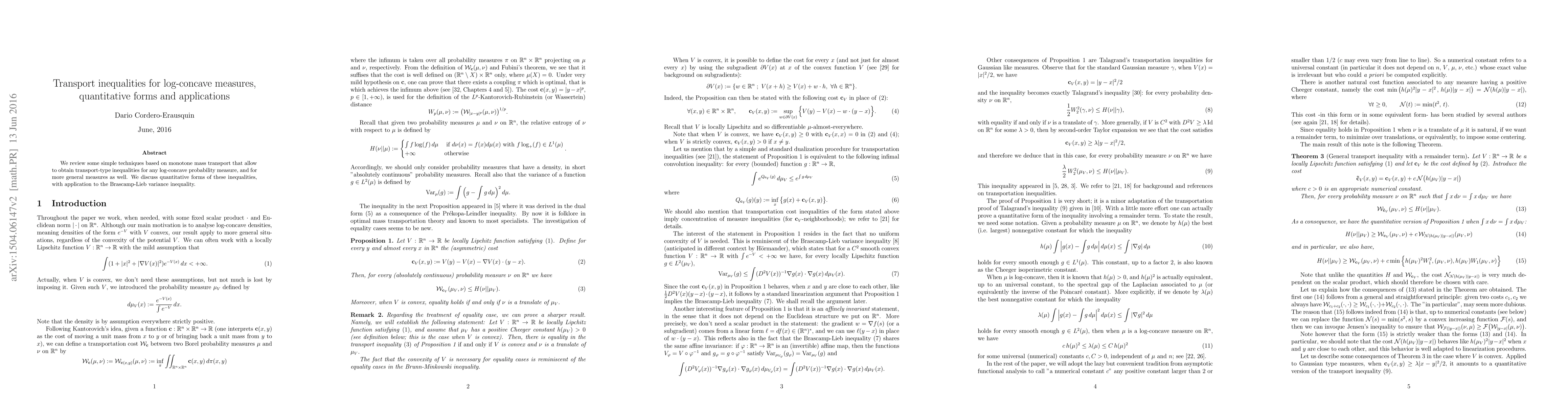 Summary: This paper reviews techniques for deriving transport inequalities for log-concave probability measures, focusing on quantitative forms and applications, particularly in relation to the Brascamp-Lieb variance inequality. The discussed methods utilize monotone mass transport.