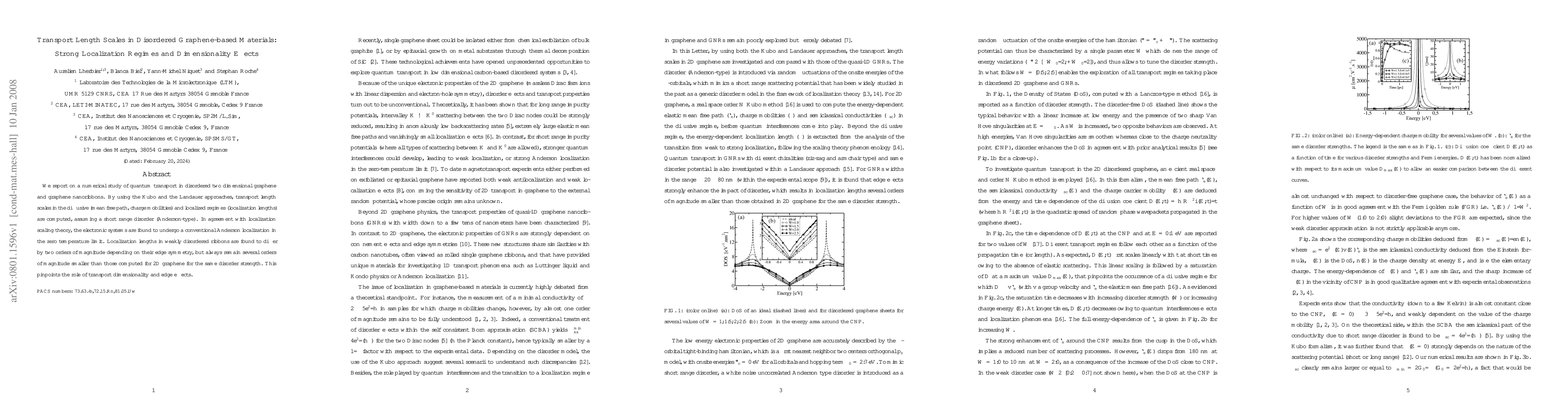 This study numerically investigates quantum transport in disordered graphene and graphene nanoribbons, revealing strong localization effects and significant dimensionality impacts. The research finds that localization lengths in graphene nanoribbons vary greatly with edge symmetry but remain much smaller than those in 2D graphene, highlighting the influence of edge effects and transport dimensionality.