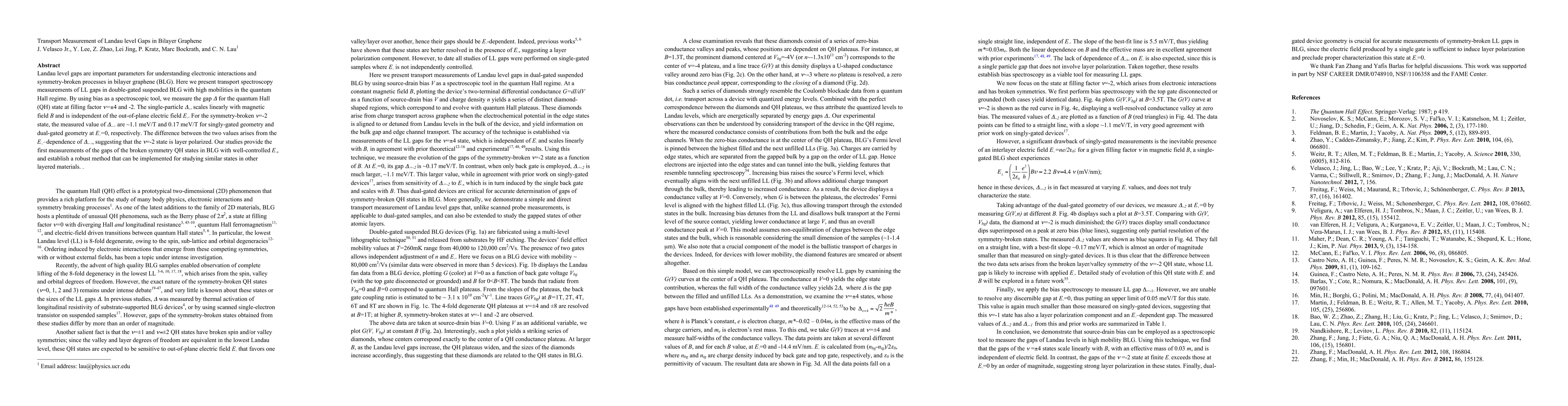 This paper reports transport spectroscopy measurements of Landau level gaps in high-mobility bilayer graphene, revealing a linear scaling of the gap with magnetic field for the ν=±4 state and distinct E-field dependencies for the symmetry-broken ν=-2 state, indicating layer polarization. The study establishes a method for studying broken symmetry quantum Hall states in layered materials.