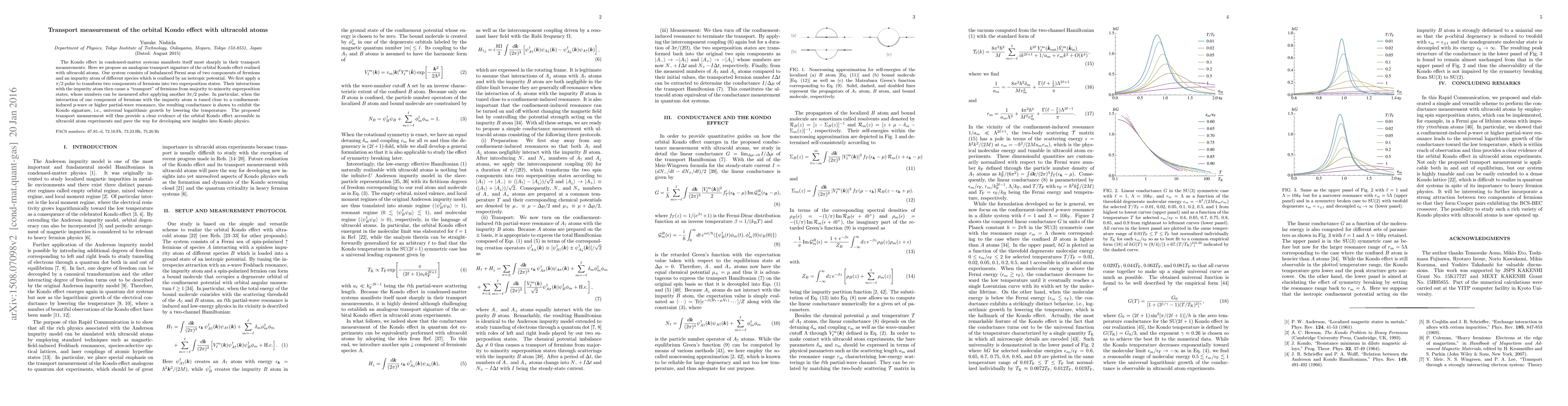 This paper proposes a method to measure the orbital Kondo effect in ultracold atom systems through transport measurements, demonstrating a logarithmic growth in conductance as temperature decreases, akin to the Kondo effect in condensed matter systems. The experiment uses imbalanced Fermi seas and an impurity atom, revealing the effect through a series of pulse transformations and subsequent conductance measurements.