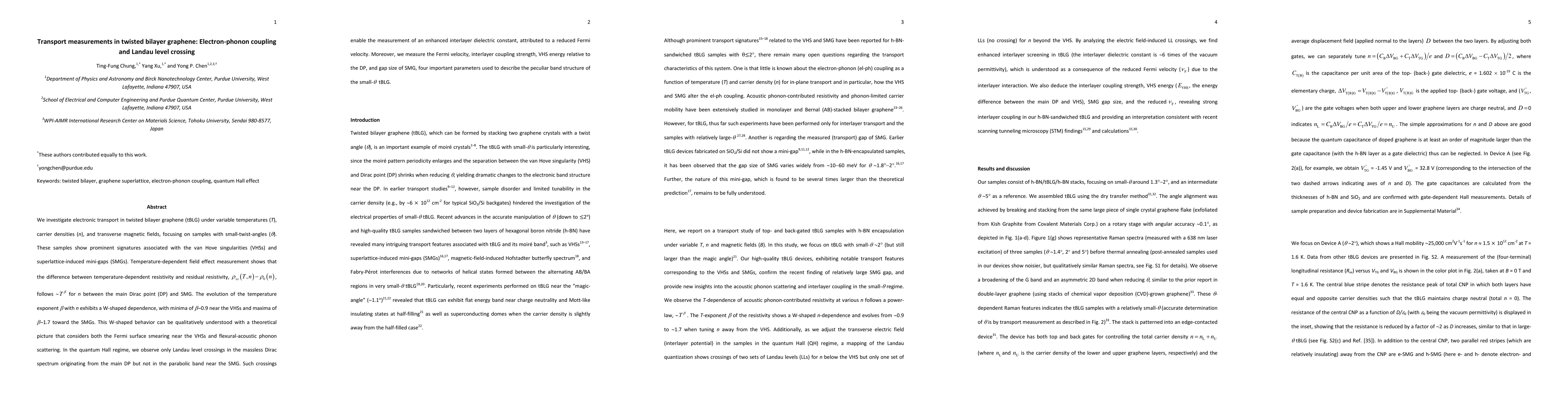 We investigate electronic transport in twisted bilayer graphene (tBLG) under variable temperatures ($T$), carrier densities ($n$), and transverse magnetic fields, focusing on samples with small-twist-angles ($\theta$). These samples show prominent signatures associated with the van Hove singularities (VHSs) and superlattice-induced mini-gaps (SMGs). Temperature-dependent field effect measurement shows that the difference between temperature-dependent resistivity and residual resistivity, $\rho_{xx}(n,T) - \rho_{0}(n)$, follows $~T^\beta$ for $n$ between the main Dirac point (DP) and SMG. The evolution of the temperature exponent $\beta$ with $n$ exhibits a W-shaped dependence, with minima of $\beta$ ~0.9 near the VHSs and maxima of $\beta$ ~1.7 toward the SMGs. This W-shaped behavior can be qualitatively understood with a theoretical picture that considers both the Fermi surface smearing near the VHSs and flexural-acoustic phonon scattering. In the quantum Hall regime, we observe only Landau level crossings in the massless Dirac spectrum originating from the main DP but not in the parabolic band near the SMG. Such crossings enable the measurement of an enhanced interlayer dielectric constant, attributed to a reduced Fermi velocity. Moreover, we measure the Fermi velocity, interlayer coupling strength, VHS energy relative to the DP, and gap size of SMG, four important parameters used to describe the peculiar band structure of the small-$\theta$ tBLG.