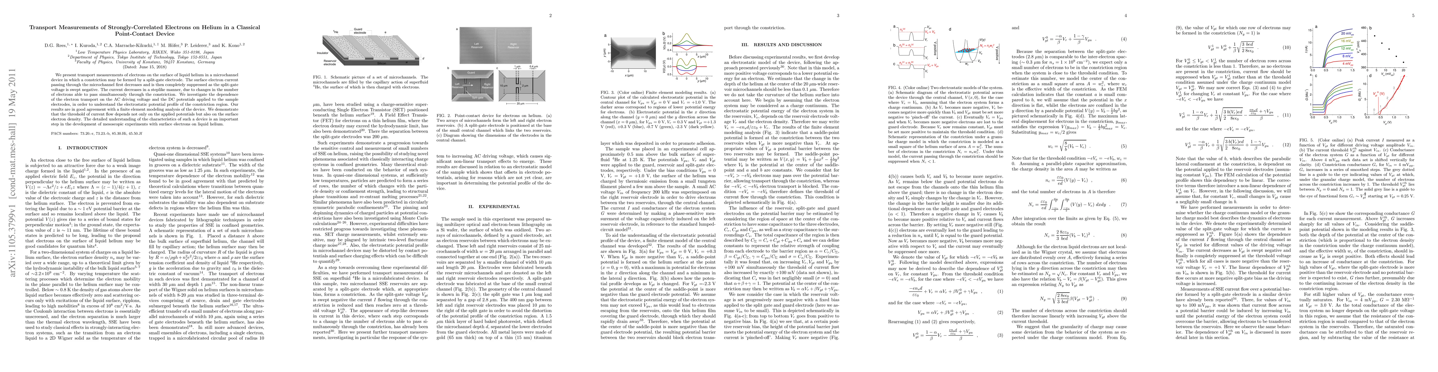 We present transport measurements of electrons on the surface of liquid helium in a microchannel device in which a constriction may be formed by a split-gate electrode. The surface electron current passing through the microchannel first decreases and is then completely suppressed as the split-gate voltage is swept negative. The current decreases in a steplike manner, due to changes in the number of electrons able to pass simultaneously through the constriction. We investigate the dependence of the electron transport on the AC driving voltage and the DC potentials applied to the sample electrodes, in order to understand the electrostatic potential profile of the constriction region. Our results are in good agreement with a finite element modeling analysis of the device. We demonstrate that the threshold of current flow depends not only on the applied potentials but also on the surface electron density. The detailed understanding of the characteristics of such a device is an important step in the development of mesoscopic experiments with surface electrons on liquid helium.