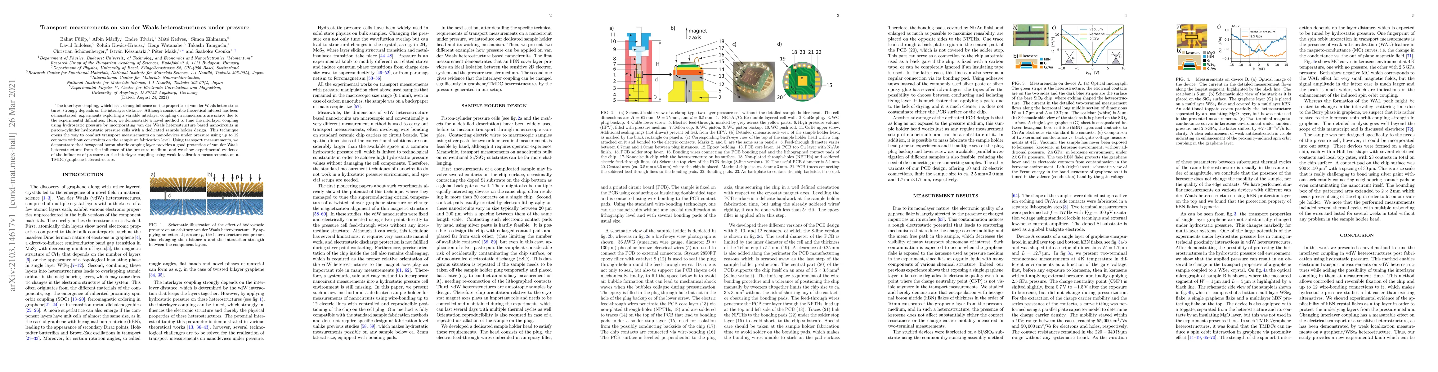 The interlayer coupling, which has a strong influence on the properties of van der Waals heterostructures, strongly depends on the interlayer distance. Although considerable theoretical interest has been demonstrated, experiments exploiting a variable interlayer coupling on nanocircuits are scarce due to the experimental difficulties. Here, we demonstrate a novel method to tune the interlayer coupling using hydrostatic pressure by incorporating van der Waals heterostructure based nanocircuits in piston-cylinder hydrostatic pressure cells with a dedicated sample holder design. This technique opens the way to conduct transport measurements on nanodevices under pressure using up to 12 contacts without constraints on the sample at fabrication level. Using transport measurements, we demonstrate that hexagonal boron nitride capping layer provides a good protection of van der Waals heterostructures from the influence of the pressure medium, and we show experimental evidence of the influence of pressure on the interlayer coupling using weak localization measurements on a TMDC/graphene heterostructure.
