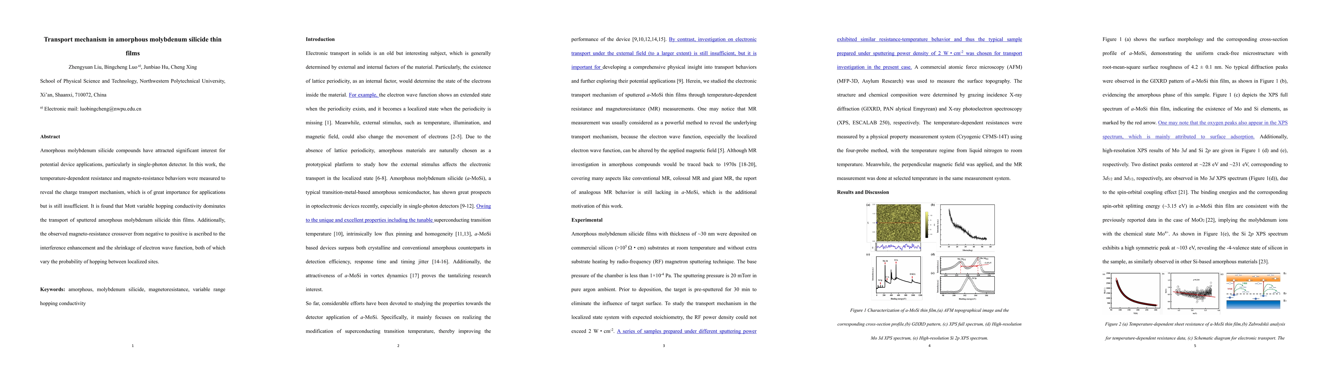 This study investigates the charge transport mechanism in amorphous molybdenum silicide thin films, finding that Mott variable hopping conductivity governs their behavior. The observed magneto-resistance transition from negative to positive is attributed to interference enhancement and electron wave function shrinkage affecting hopping probabilities.