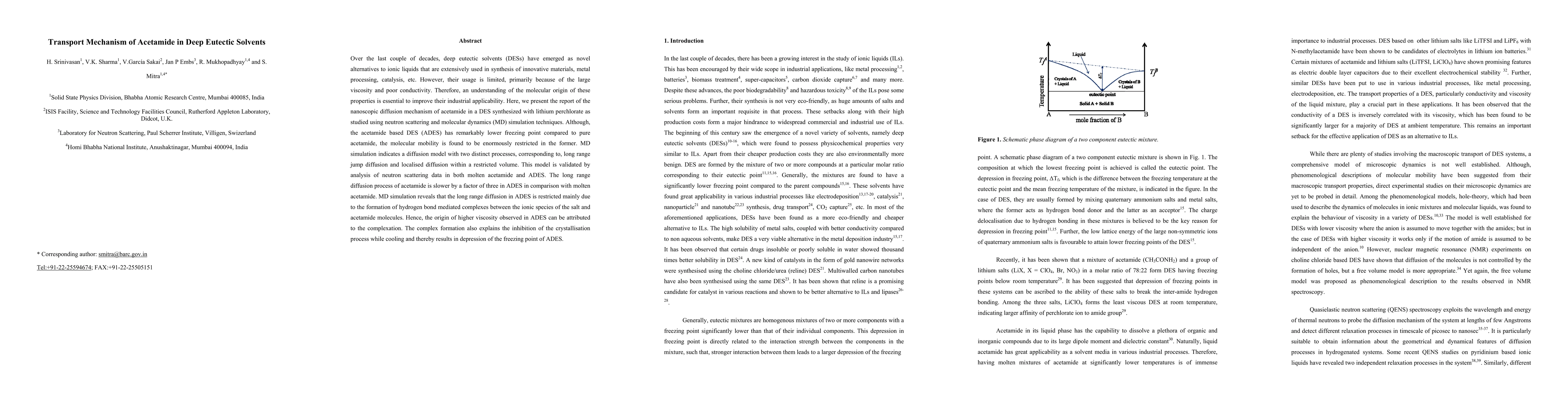 This study explores the transport mechanism of acetamide in deep eutectic solvents (DESs) using neutron scattering and molecular dynamics simulations. The research reveals that acetamide diffusion in DESs involves two distinct processes, with long-range diffusion being significantly slower due to hydrogen bond-mediated complexes formed between the salt and acetamide, explaining the higher viscosity and lower freezing point of DESs.