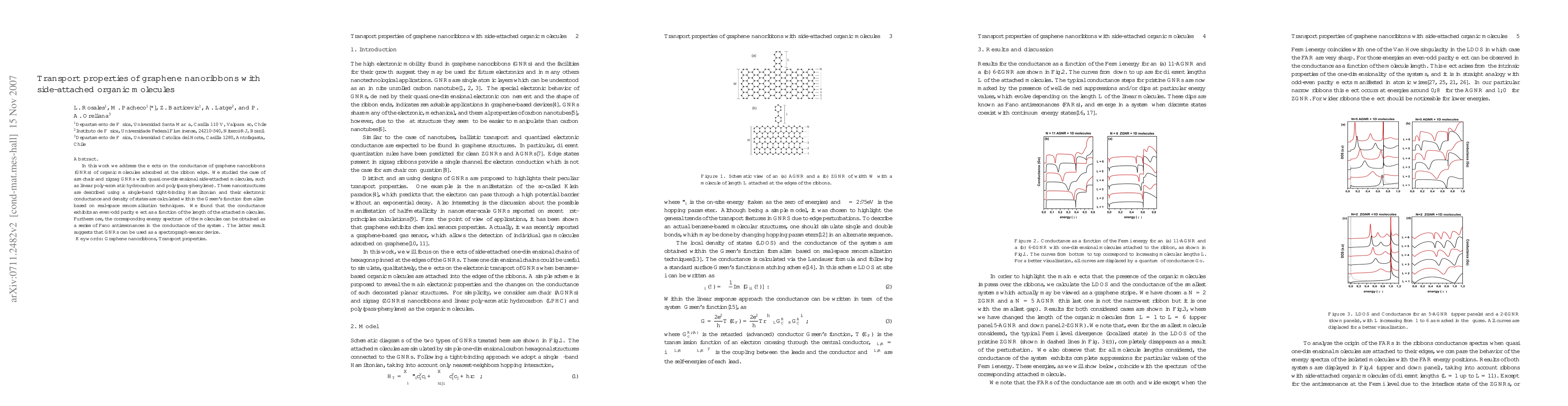 In this work we address the effects on the conductance of graphene nanoribbons (GNRs) at which organic molecules are side-attached on the ribbon ends. For simplicity, only armchair (AGNRs) and zigzag (ZGNRs) nanoribbons are considered and quasi one-dimensional molecules, such as linear poly-aromatic hydrocarbon (LPHC) and poly(para-phenylene), are chosen. The conductance of the GNRs exhibit a particular behavior as a function of the length of the organic molecules: the energy spectrum of the quasi one-dimensional system is clearly reflected in the conductance curves of the GNRs. The results suggest that GNRs can be used as an spectrograph-sensor device. An even-odd parity effect, as a function of the length of the attached molecules, can be observed in the conductance of these system. The nanostructures are described using a single-band tight binding Hamiltonian and the electronic conductance and the density of states of the systems are calculated within the Green's function formalism based on real-space renormalization techniques.