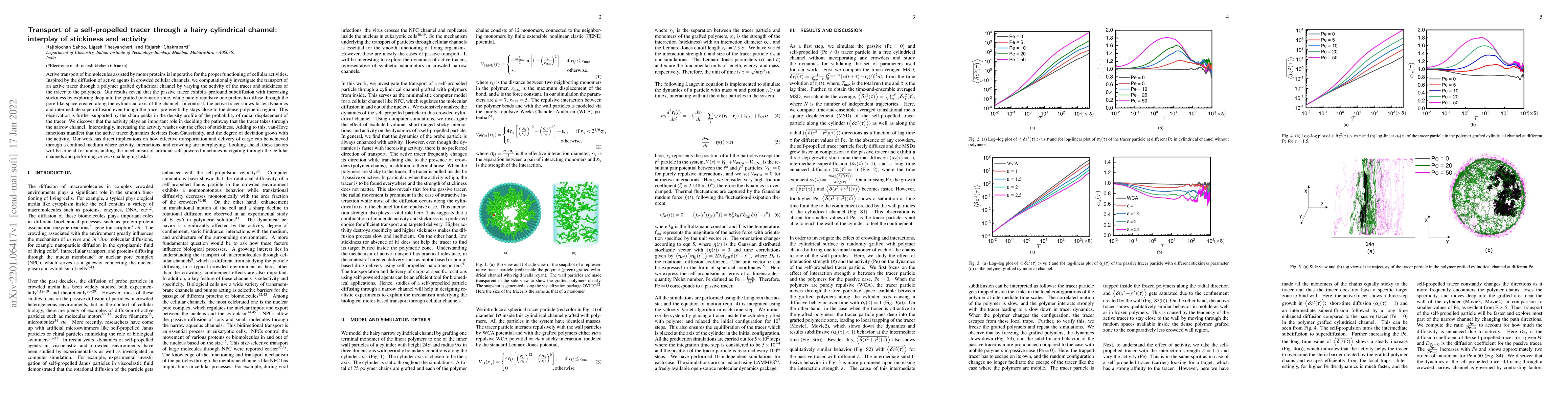 This paper computationally explores how active tracers move through a polymer-grafted cylindrical channel, revealing that increased tracer activity leads to faster dynamics and intermediate superdiffusion, washing out the stickiness effect. The study highlights the interplay between activity, stickiness, and the channel's structure, with implications for the transportation of cargo in crowded cellular environments.