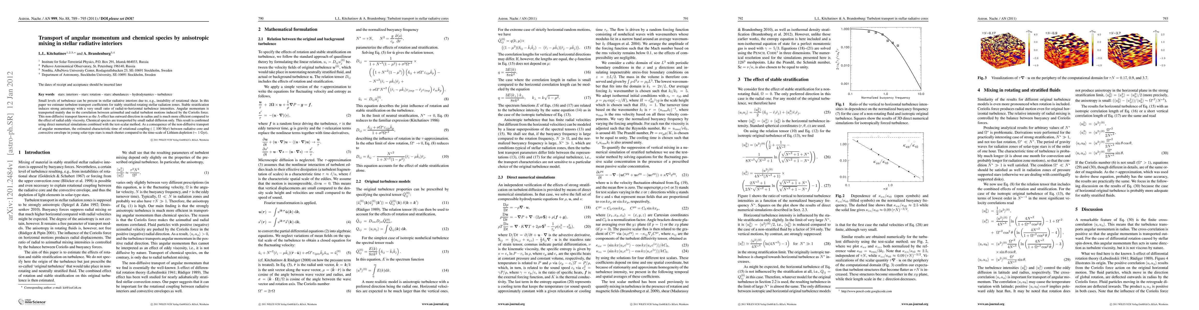 This paper investigates the transport of angular momentum and chemical species in the radiative interiors of rotating stars, finding that turbulence induces anisotropic mixing. The Lambda-effect efficiently transports angular momentum outward due to the Coriolis force, while chemical species are primarily transported via small radial diffusion.