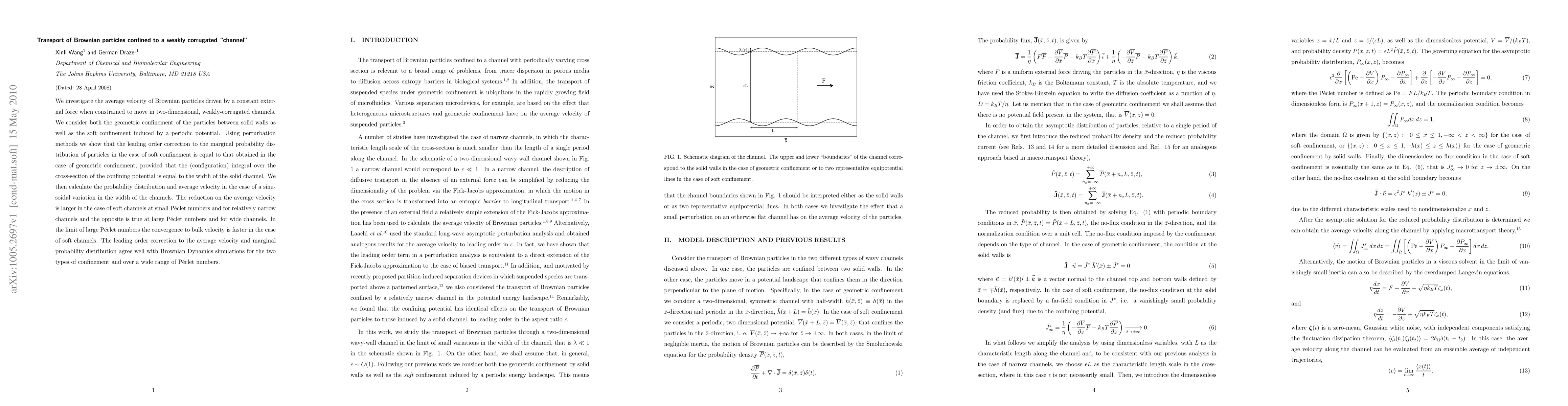 This paper examines the average velocity of Brownian particles in weakly corrugated channels, comparing geometric and soft confinement effects. It finds that the leading order correction to the marginal probability distribution and average velocity is similar for both types of confinement under certain conditions, with significant differences in velocity reduction depending on channel geometry and P\'eclet numbers.