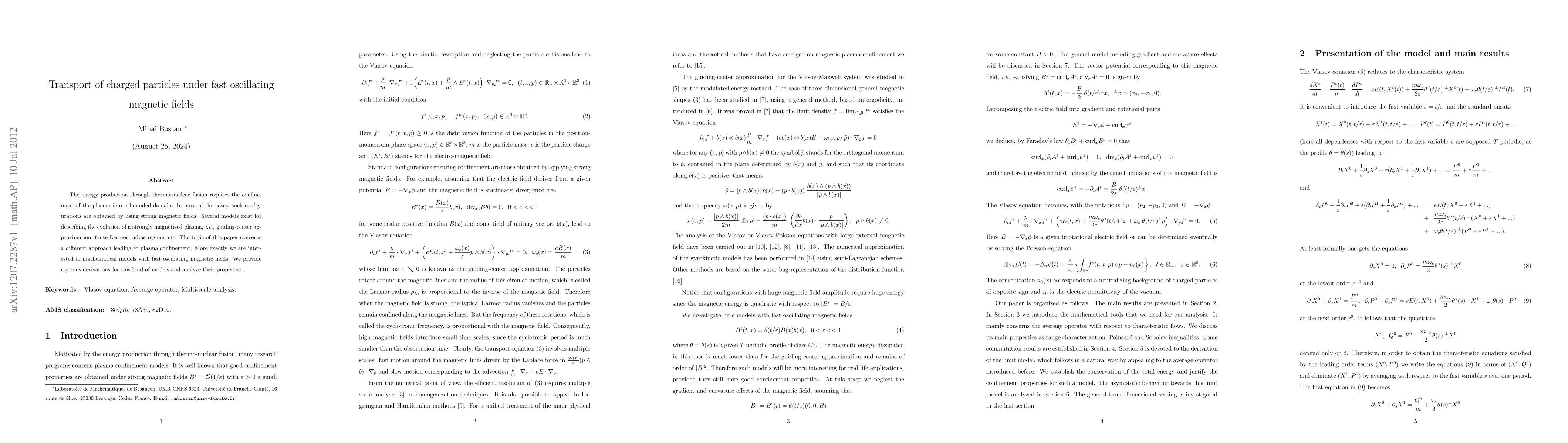The energy production through thermo-nuclear fusion requires the confinement of the plasma into a bounded domain. In most of the cases, such configurations are obtained by using strong magnetic fields. Several models exist for describing the evolution of a strongly magnetized plasma, i.e., guiding-center approximation, finite Larmor radius regime, etc. The topic of this paper concerns a different approach leading to plasma confinement. More exactly we are interested in mathematical models with fast oscillating magnetic fields. We provide rigorous derivations for this kind of models and analyze their properties.