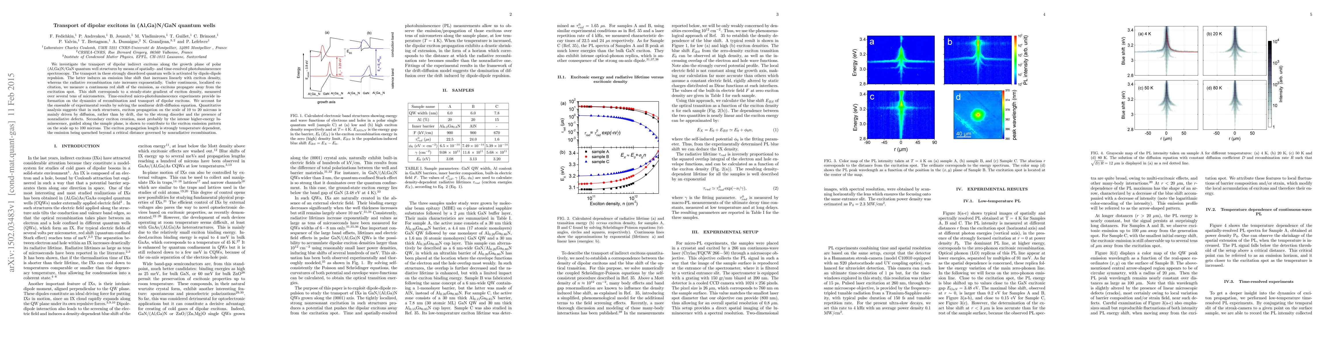 We investigate the transport of dipolar indirect excitons along the growth plane of polar (Al,Ga)N/GaN quantum well structures by means of spatially- and time-resolved photoluminescence spectroscopy. The transport in these strongly disordered quantum wells is activated by dipole-dipole repulsion. The latter induces an emission blue shift that increases linearly with exciton density, whereas the radiative recombination rate increases exponentially. Under continuous, localized excitation, we measure a continuous red shift of the emission, as excitons propagate away from the excitation spot. This shift corresponds to a steady-state gradient of exciton density, measured over several tens of micrometers. Time-resolved micro-photoluminescence experiments provide information on the dynamics of recombination and transport of dipolar excitons. We account for the ensemble of experimental results by solving the nonlinear drift-diffusion equation. Quantitative analysis suggests that in such structures, exciton propagation on the scale of 10 to 20 microns is mainly driven by diffusion, rather than by drift, due to the strong disorder and the presence of nonradiative defects. Secondary exciton creation, most probably by the intense higher-energy luminescence, guided along the sample plane, is shown to contribute to the exciton emission pattern on the scale up to 100 microns. The exciton propagation length is strongly temperature dependent, the emission being quenched beyond a critical distance governed by nonradiative recombination.
