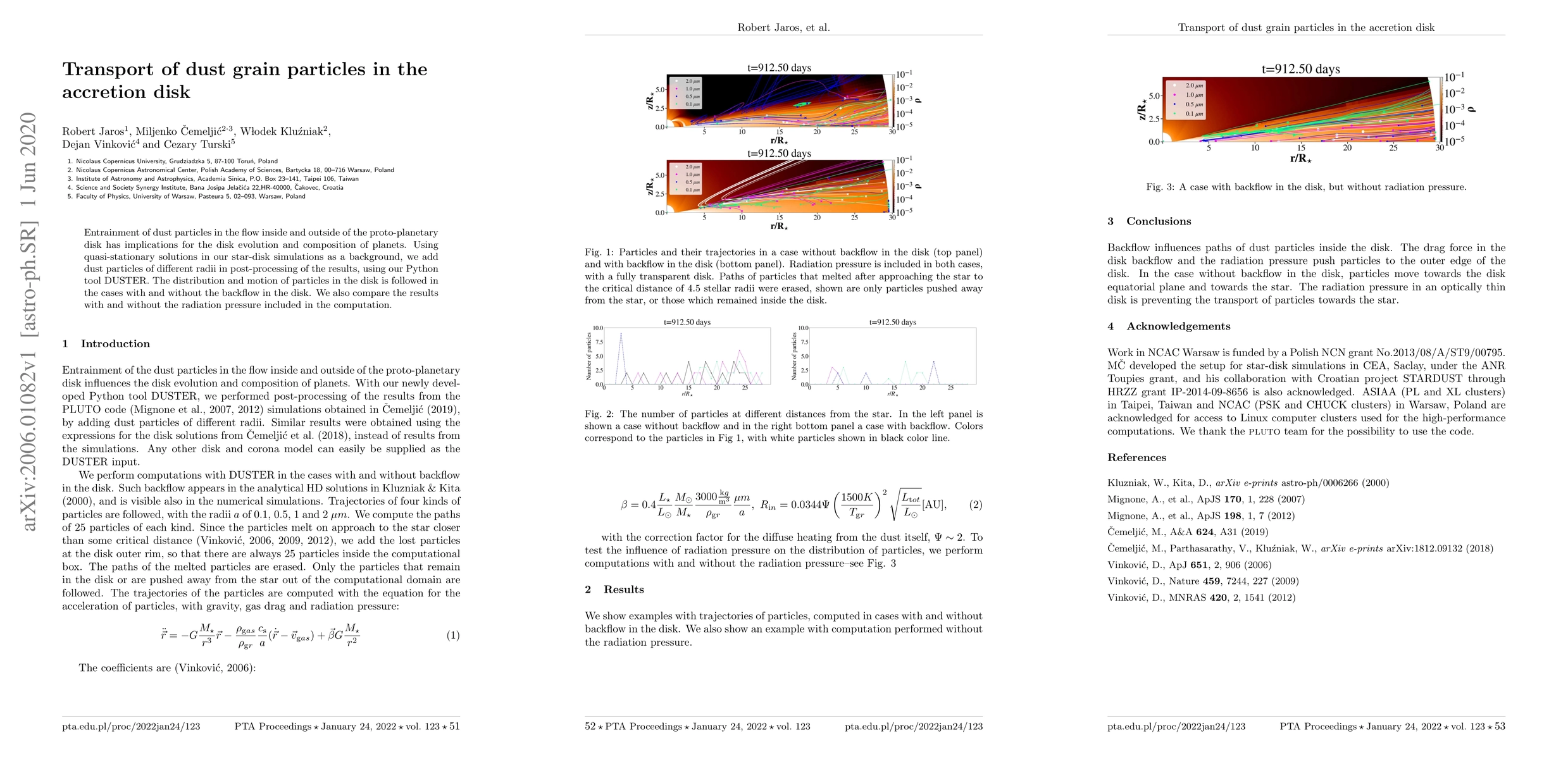 Entrainment of dust particles in the flow inside and outside of the proto-planetary disk has implications for the disk evolution and composition of planets. Using quasi-stationary solutions in our star-disk simulations as a background, we add dust particles of different radii in post-processing of the results, using our Python tool DUSTER. The distribution and motion of particles in the disk is followed in the cases with and without the backflow in the disk. We also compare the results with and without the radiation pressure included in the computation.