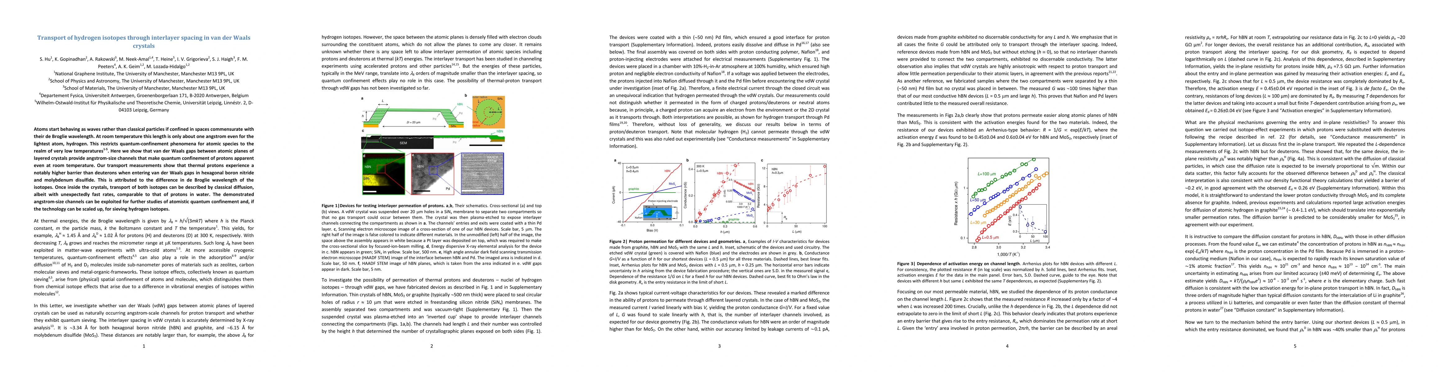 Atoms start behaving as waves rather than classical particles if confined in spaces commensurate with their de Broglie wavelength. At room temperature this length is only about one angstrom even for the lightest atom, hydrogen. This restricts quantum-confinement phenomena for atomic species to the realm of very low temperatures. Here we show that van der Waals gaps between atomic planes of layered crystals provide angstrom-size channels that make quantum confinement of protons apparent even at room temperature. Our transport measurements show that thermal protons experience a notably higher barrier than deuterons when entering van der Waals gaps in hexagonal boron nitride and molybdenum disulfide. This is attributed to the difference in de Broglie wavelength of the isotopes. Once inside the crystals, transport of both isotopes can be described by classical diffusion, albeit with unexpectedly fast rates, comparable to that of protons in water. The demonstrated angstrom-size channels can be exploited for further studies of atomistic quantum confinement and, if the technology can be scaled up, for sieving hydrogen isotopes.