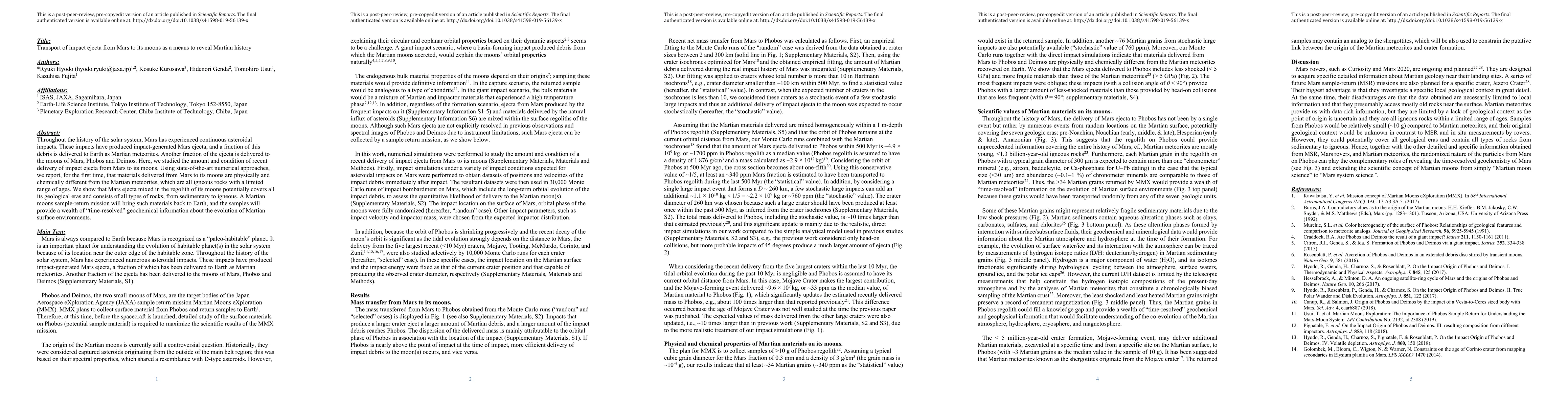 This study reveals that ejecta from Mars delivered to its moons, Phobos and Deimos, differs from Martian meteorites, encompassing a variety of rock types and potentially representing Mars' entire geological history. A sample-return mission from the Martian moons could provide valuable geochemical insights into the evolution of Mars' surface environments.