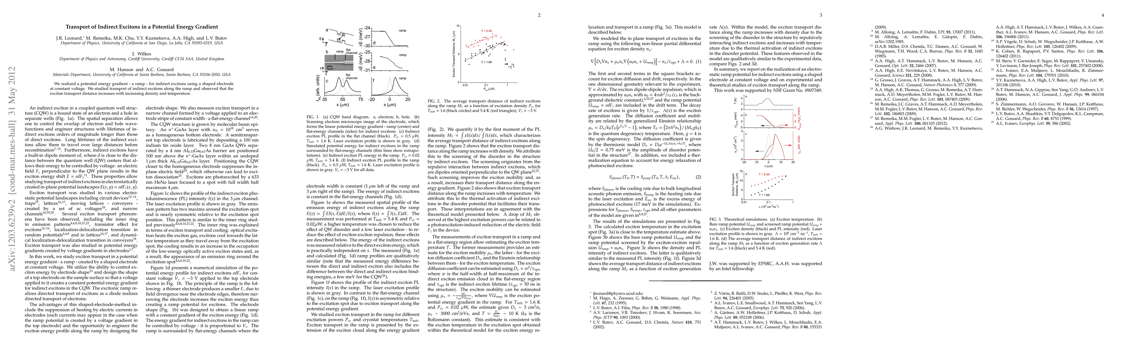 Summary: Researchers created a potential energy gradient for indirect excitons using a shaped electrode, finding that exciton transport distance increases with higher density and temperature. The study highlights the influence of density and temperature on exciton transport in a controlled potential gradient.