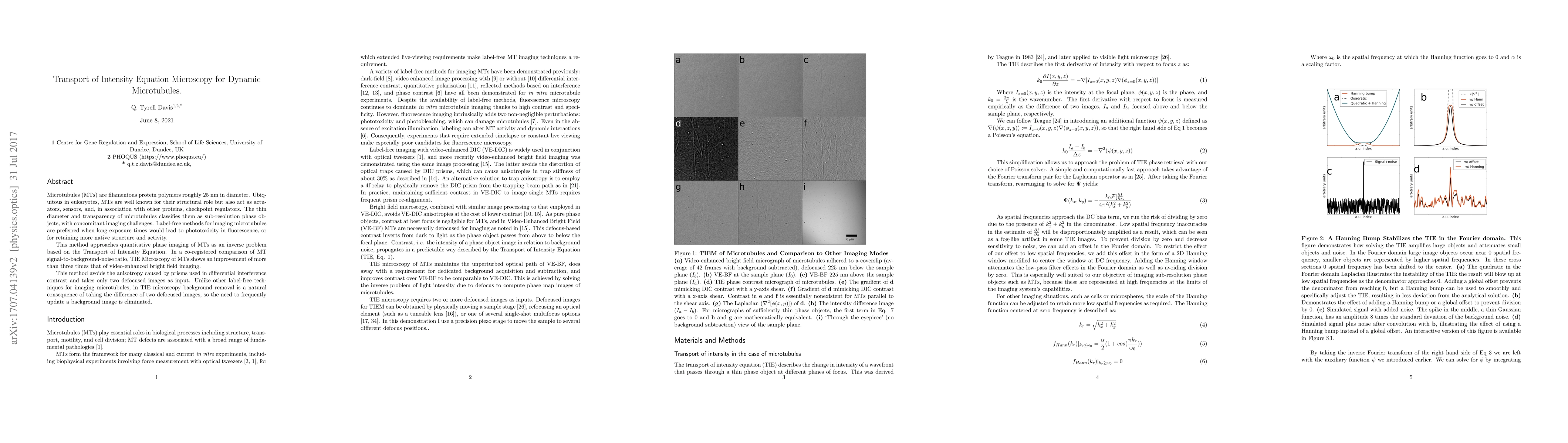This paper introduces Transport of Intensity Equation (TIE) Microscopy for imaging dynamic microtubules, demonstrating a three-fold improvement in signal-to-noise ratio over video-enhanced bright field imaging, and eliminating the need for frequent background updates.