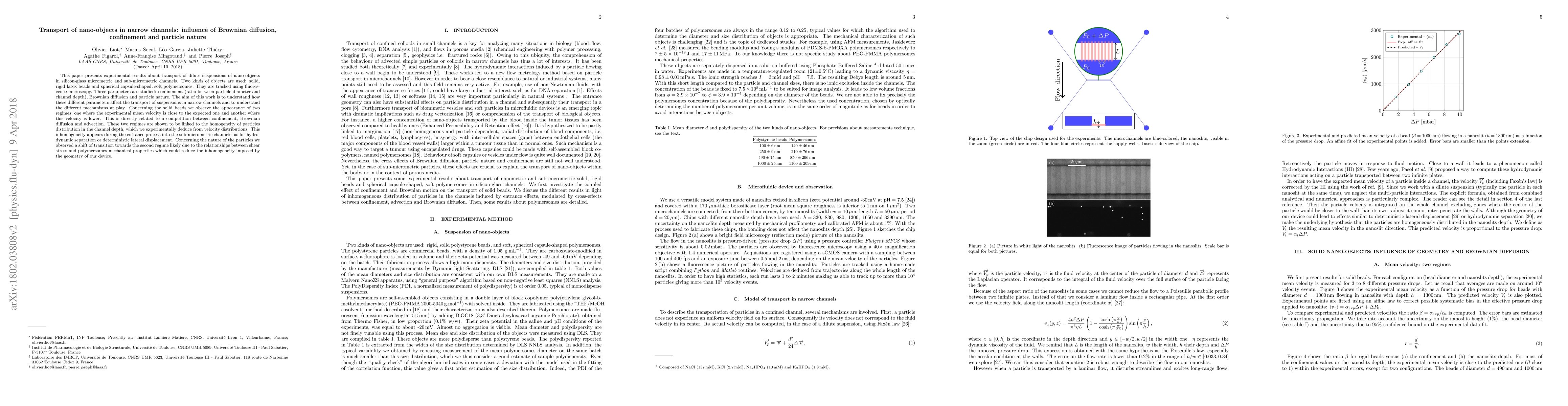 Researchers studied how nano-objects move through narrow channels, finding that confinement, Brownian diffusion, and particle nature affect their transport. They discovered two regimes of movement for solid beads, with one regime linked to homogeneous particle distribution in the channel depth.